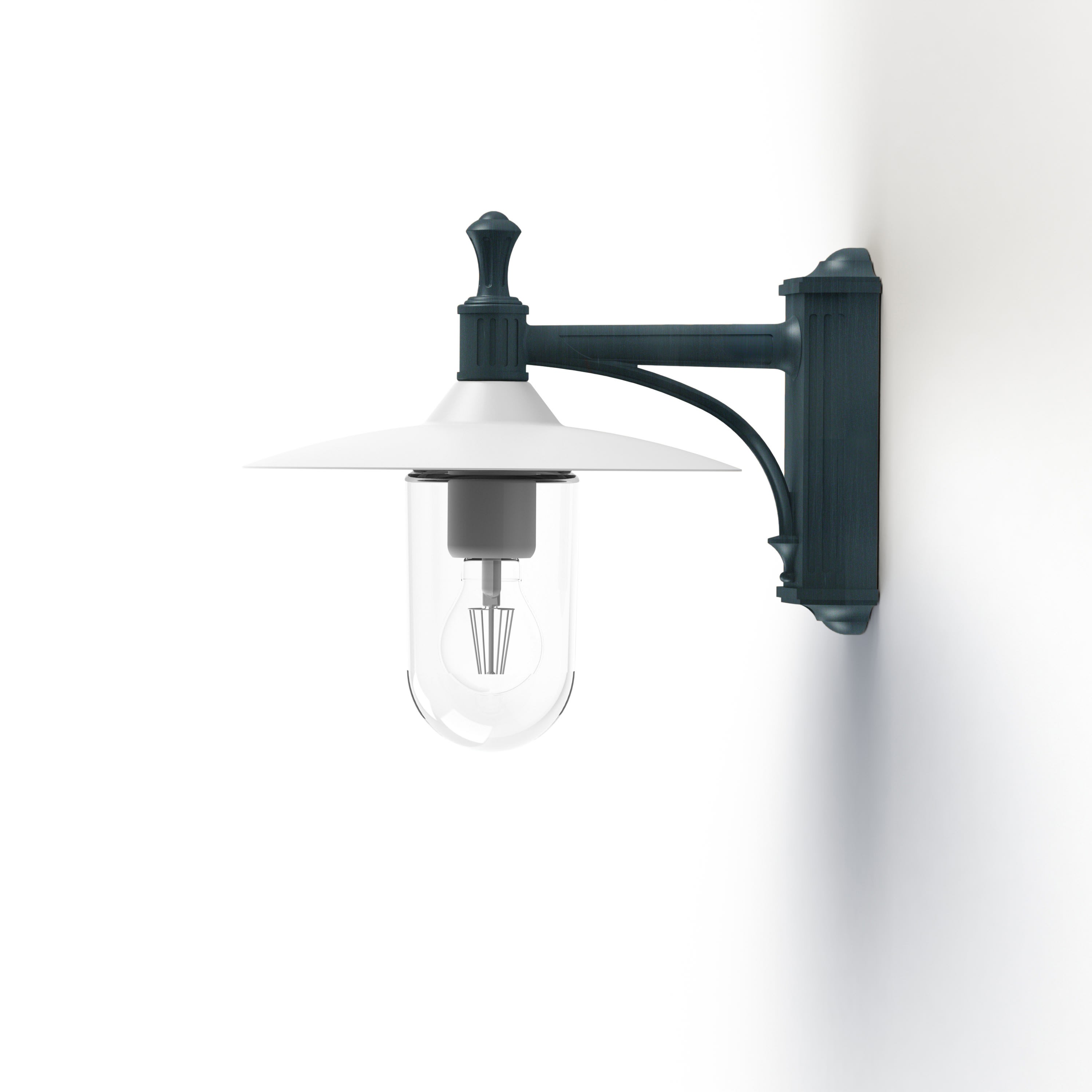 Applique descendante MONTANA en aluminium, E27, IP44, classe 1, diffuseur verre clair. Potence Finition Patine vert de gris 008, dôme blanc. Garantie 25 ans anticorrosion sur l'aluminium