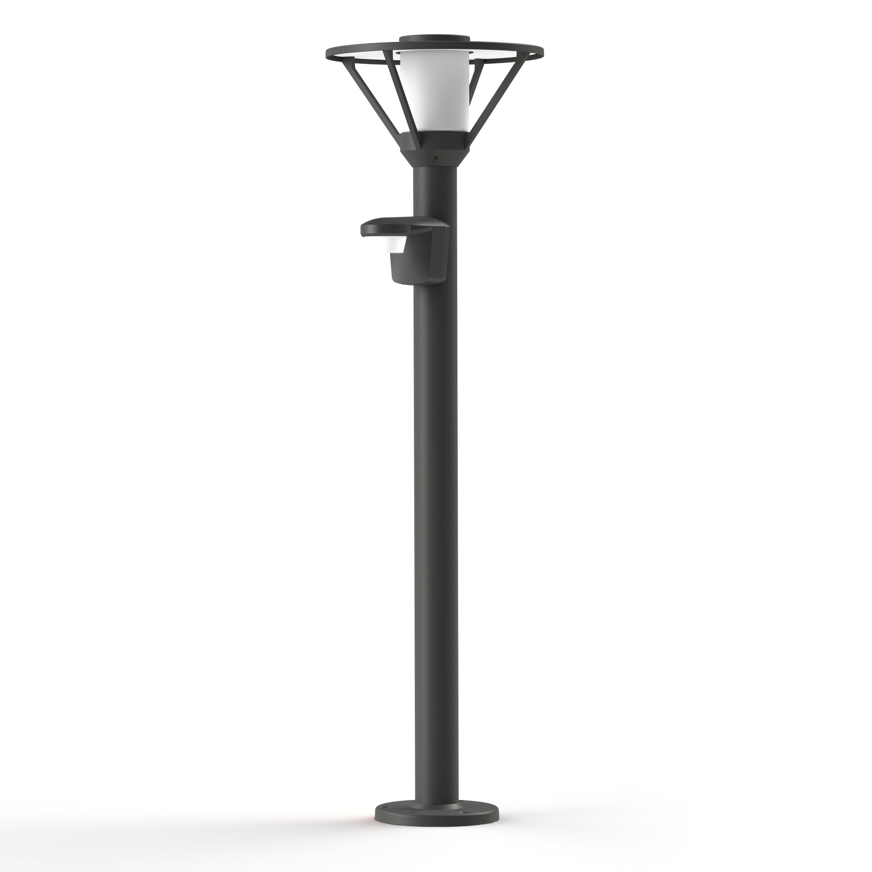 Borne BERMUDE, IP44, classe 1, hauteur 1100mm à détection, en aluminium, E27, réflecteur aluminium blanc, diffuseur verre dépoli. Teinte Gris anthracite 006. Garantie 25 ans anticorrosion sur l'aluminium