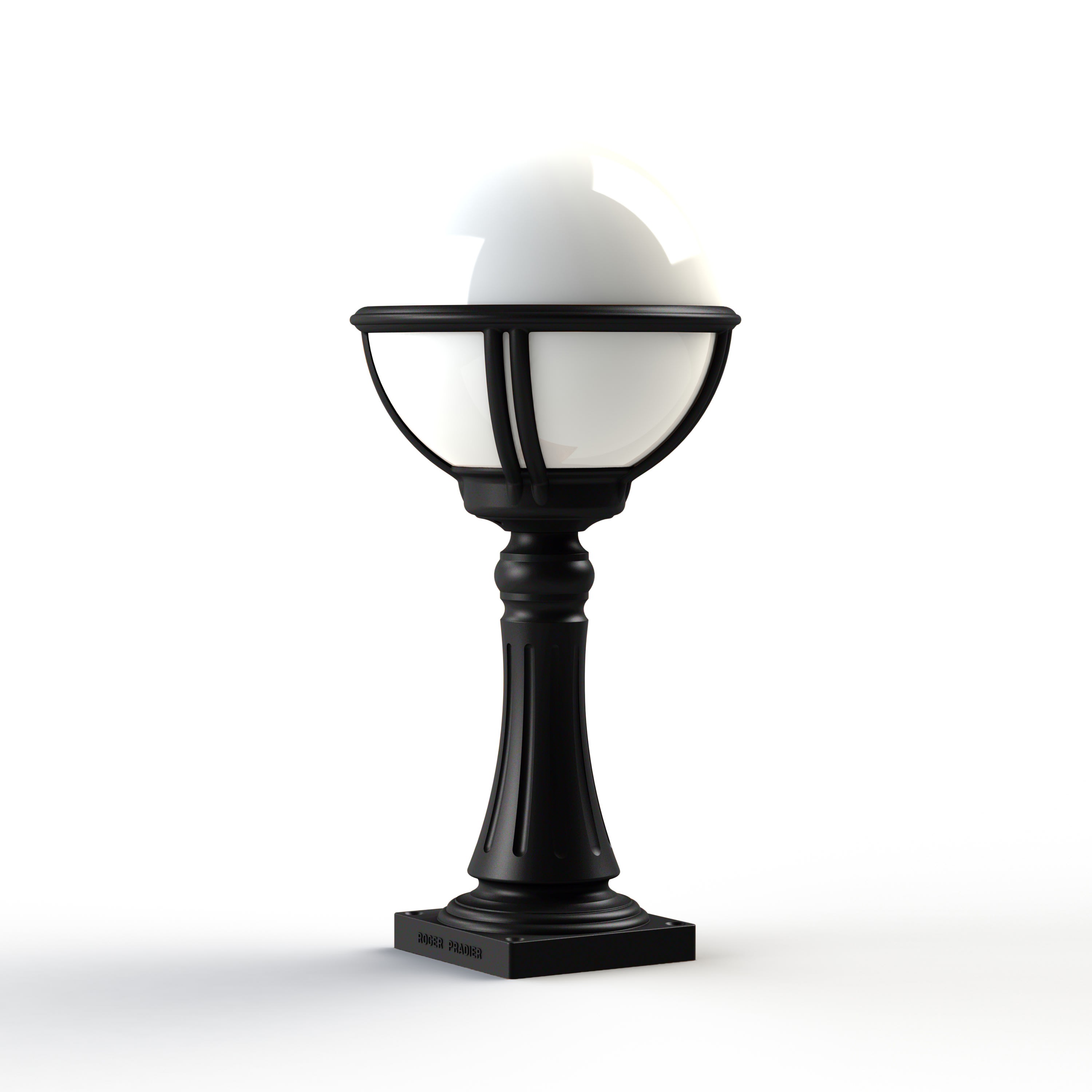 Borne BOREAL, en aluminium, E27, IP44, IK08, classe 1, globe Ø200 méthacrylate opale. Teinte RAL 9005 Noir foncé 000. Garantie 25 ans anticorrosion sur l'aluminium