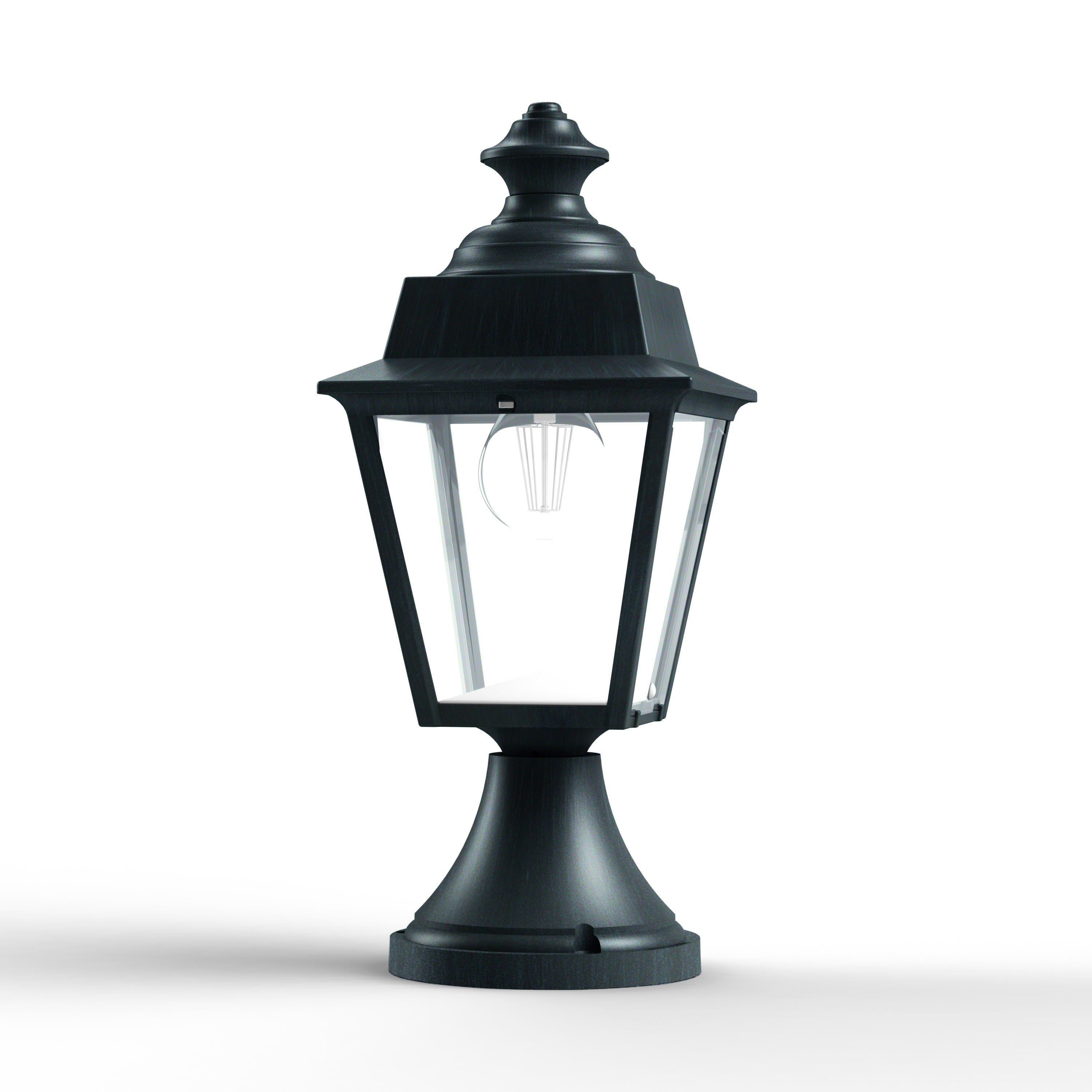 Borne CHENONCEAU en aluminium, E27, IP44, classe 1, diffuseurs verre clair. Finition Patine vert de gris 008. Garantie 25 ans anticorrosion sur l'aluminium