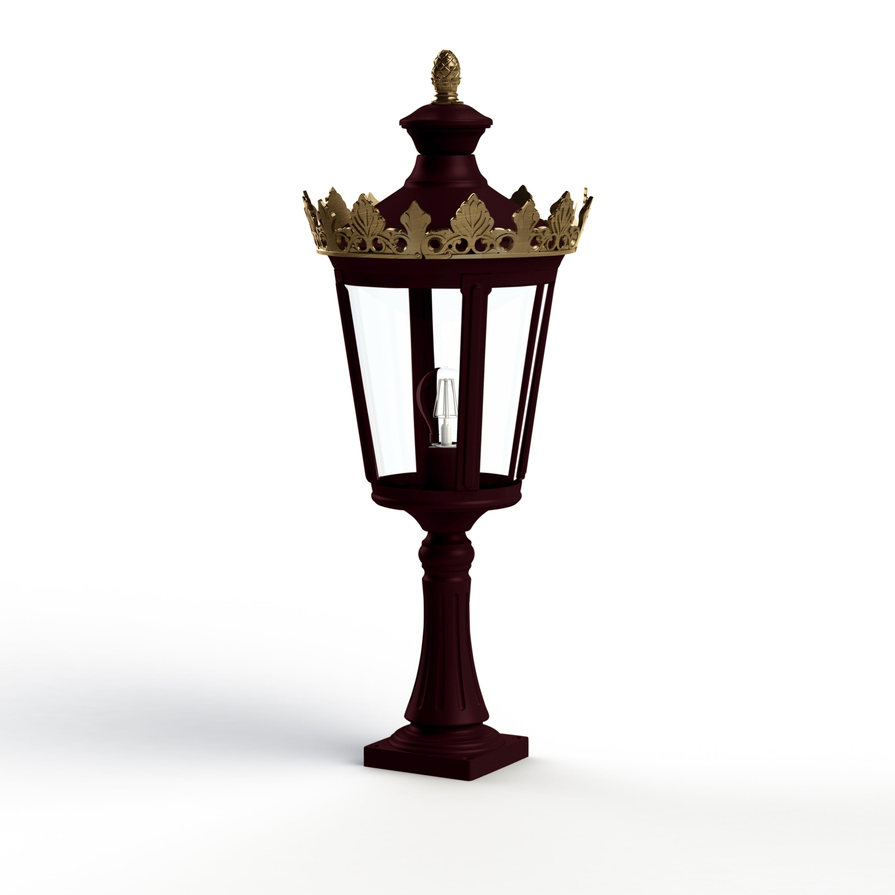 Borne LOUVRE en aluminium, hauteur 730mm, E27, IP44, classe 1, diffuseur verre clair soufflé. Teinte RAL 3005 Rouge vin 066, couronne dorée. Garantie 25 ans anticorrosion sur l'aluminium