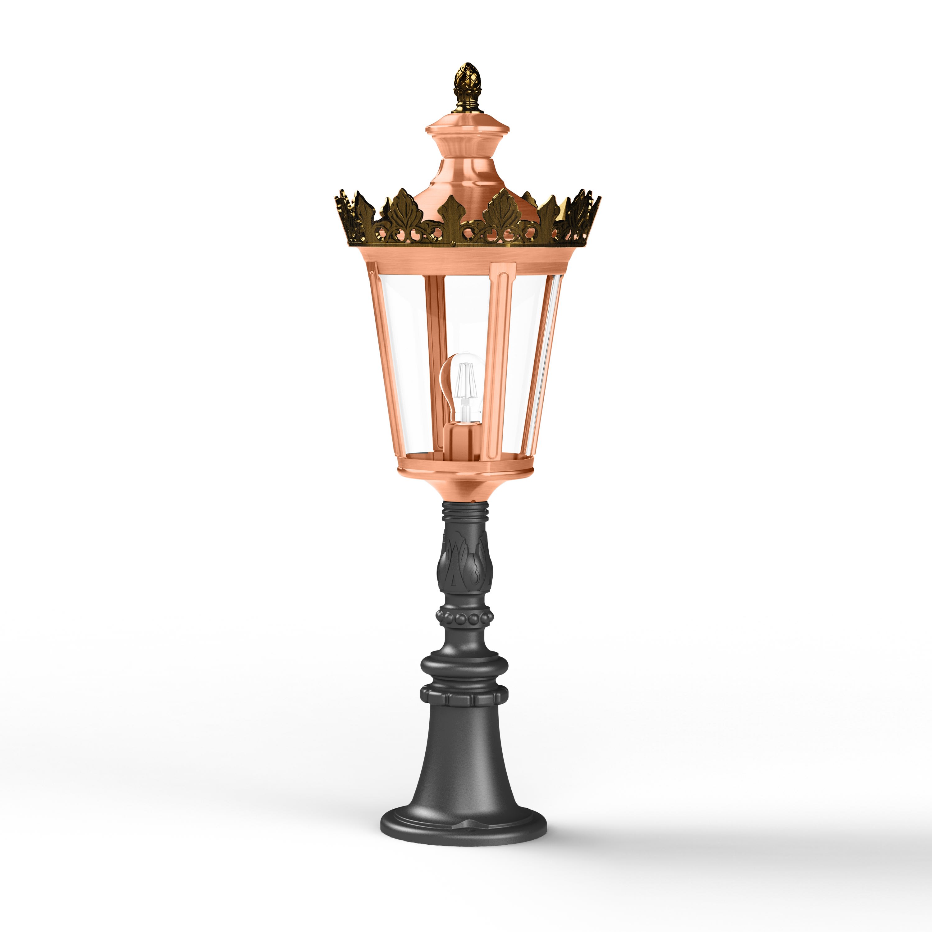 Borne LOUVRE, hauteur 860mm, E27, IP44, classe 1, diffuseur verre clair soufflé. Matière lanterne : cuivre patiné vernis 080. Matière borne : aluminium, teinte RAL 9005 noir foncé 000, couronne dorée