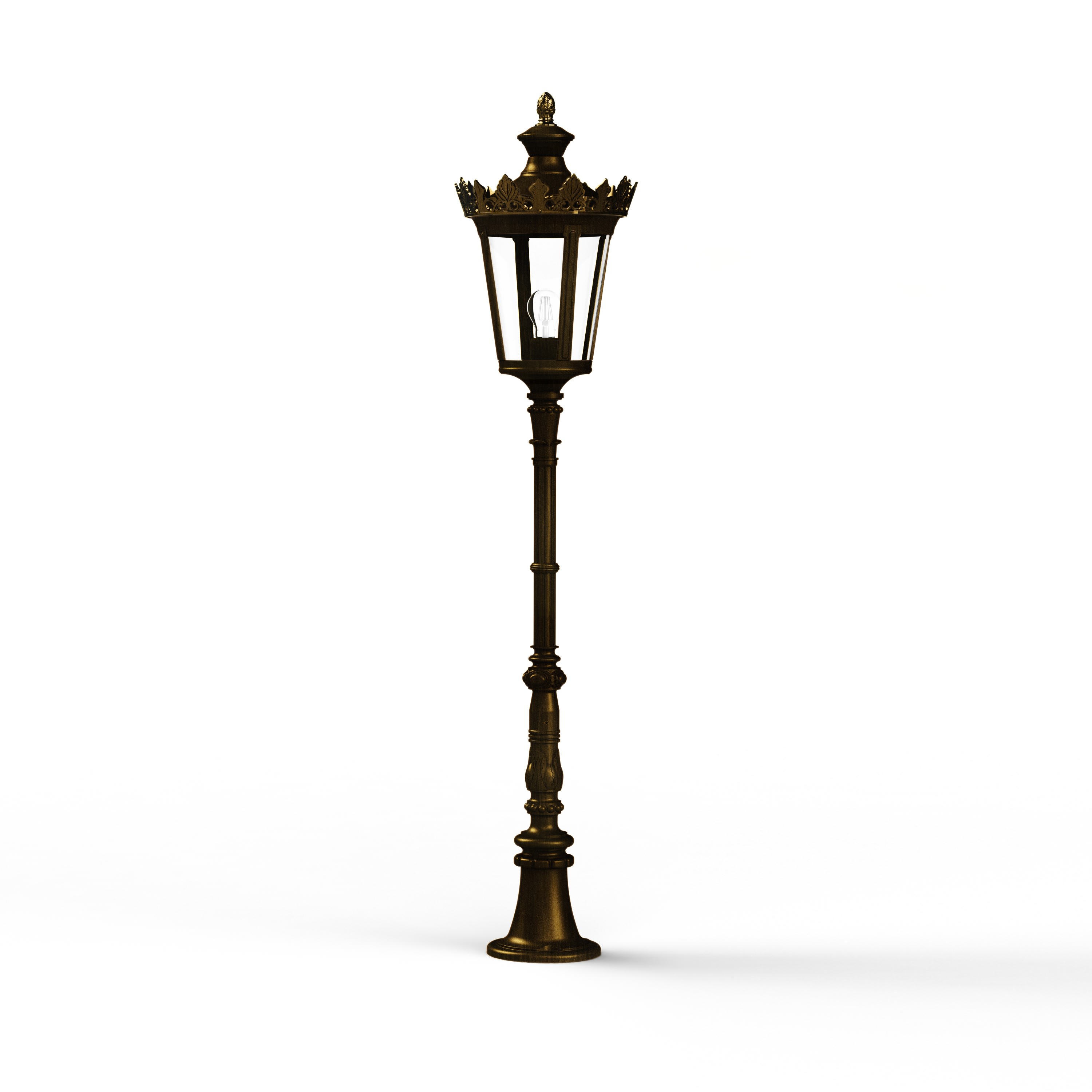 Borne LOUVRE en aluminium, hauteur 1404mm, E27, IP44, classe 1, diffuseur verre clair soufflé. Finition Patine dorée 009. Garantie 25 ans anticorrosion sur l'aluminium