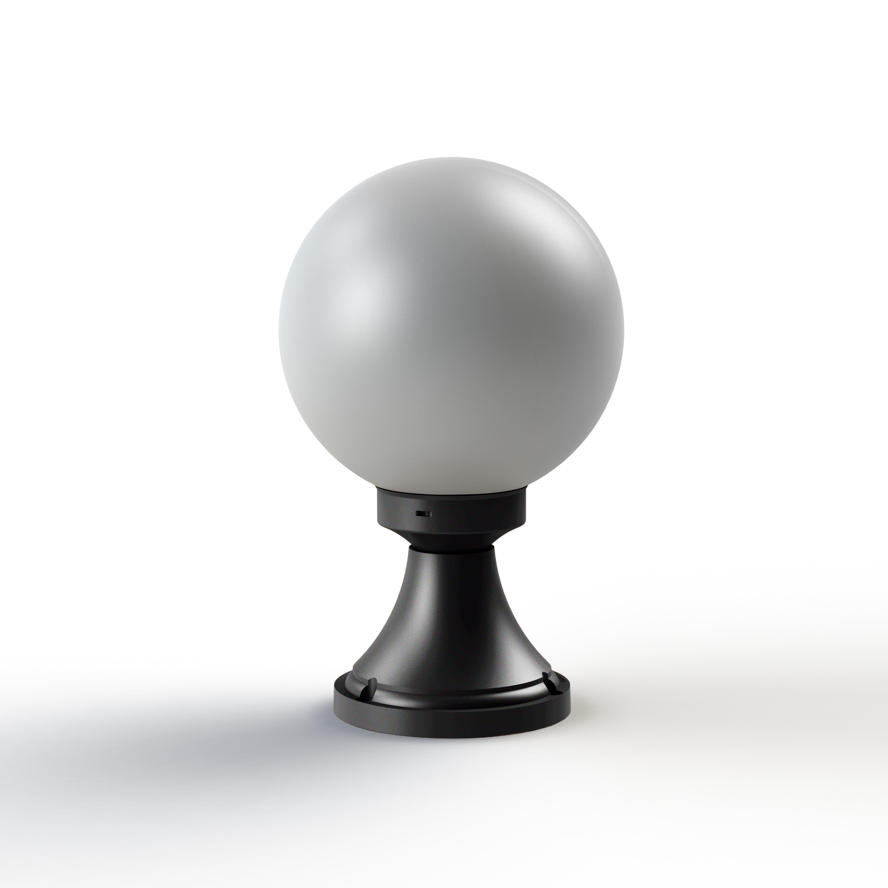 Borne MOON, en aluminium, E27, IP44, IK08, classe 1, globe Ø 200 méthacrylate opale. Teinte RAL 9005 Noir foncé 000. Garantie 25 ans anticorrosion sur l'aluminium