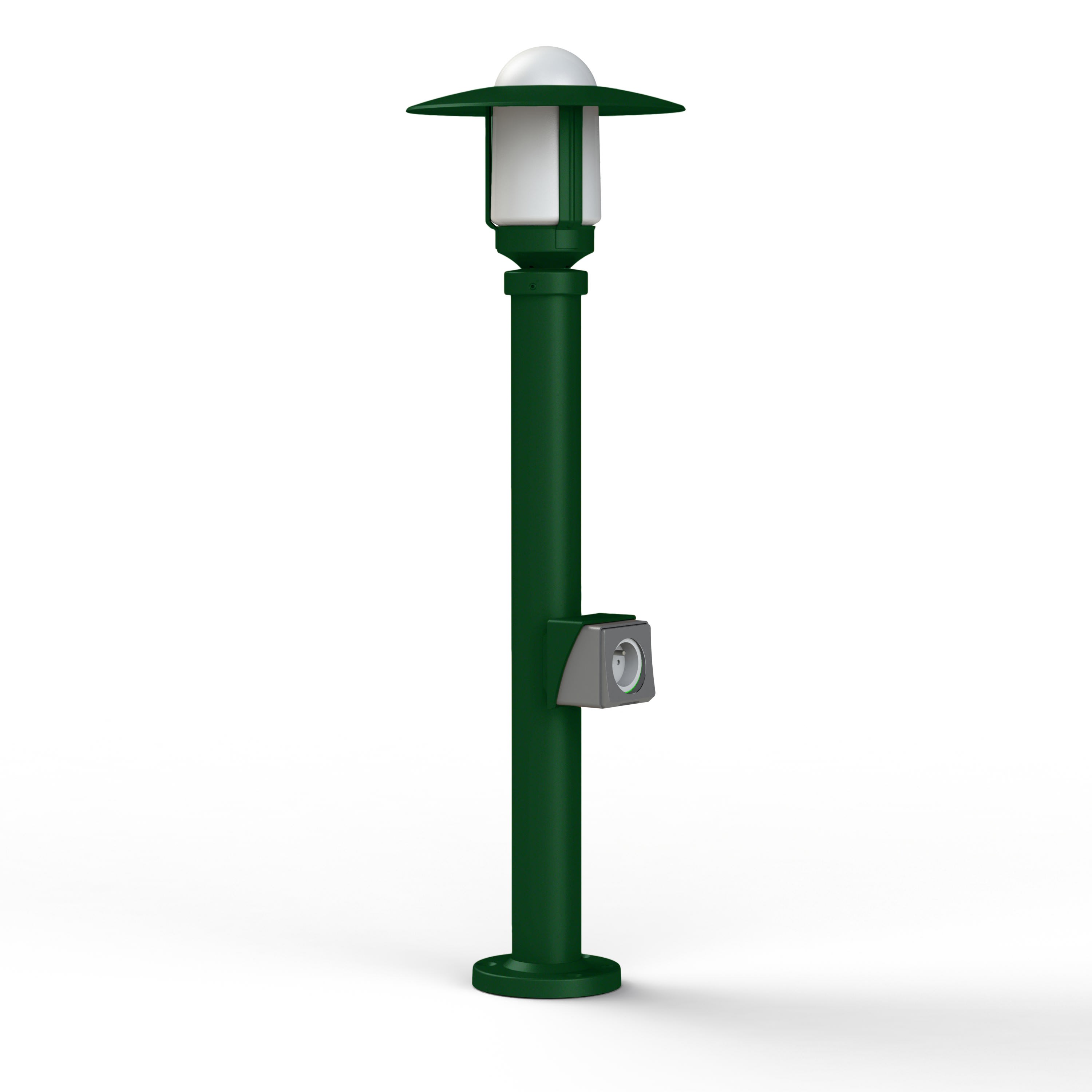 Borne NEWPARK en aluminium, avec prise, hauteur 855mm, E27, IP44, classe 1, diffuseur verre dépoli. Teinte RAL 6009 Vert sapin 067. Garantie 25 ans anticorrosion sur l'aluminium