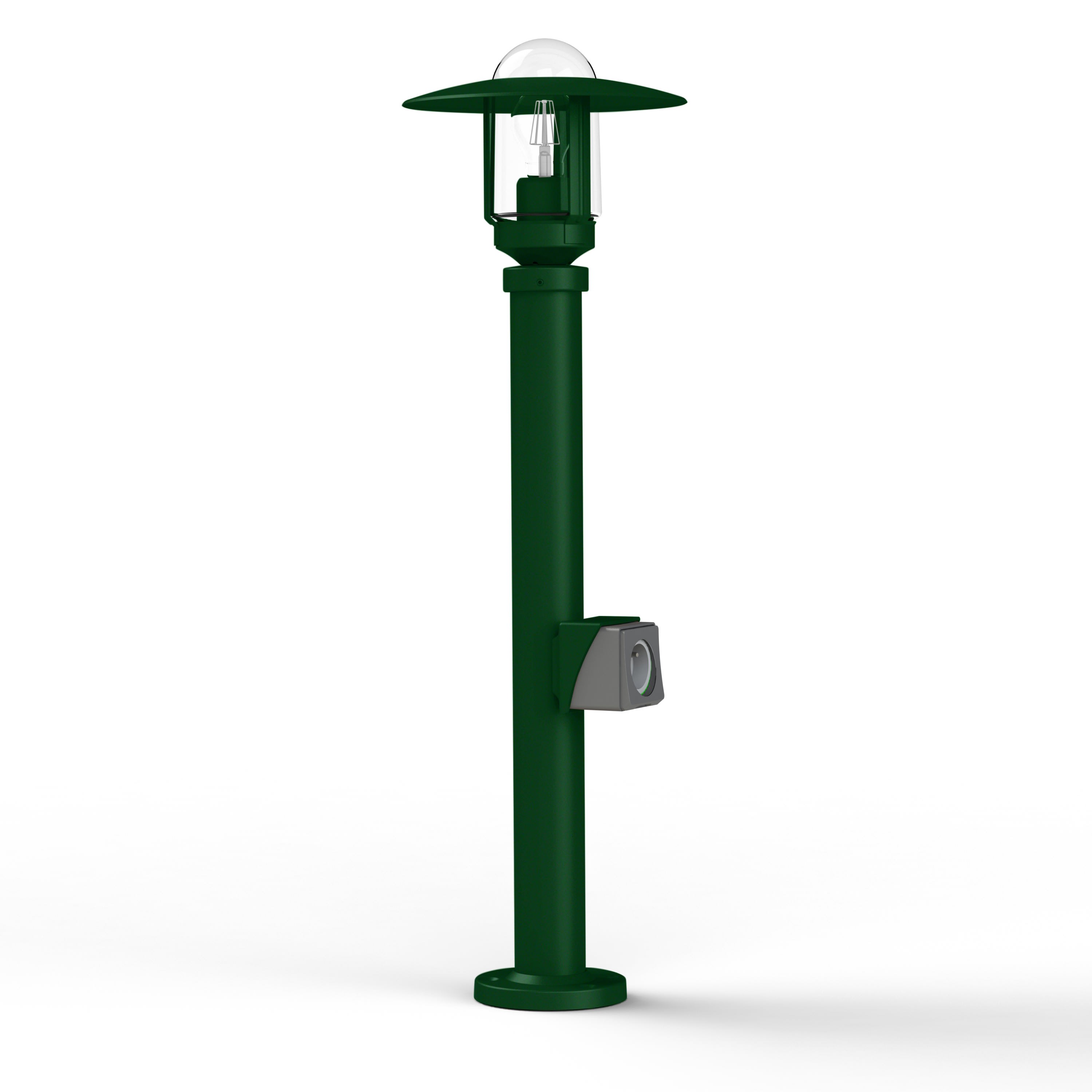 Borne NEWPARK en aluminium, avec prise, hauteur 855mm, E27, IP44, classe 1, diffuseur verre clair. Teinte RAL 6009 Vert sapin 067. Garantie 25 ans anticorrosion sur l'aluminium