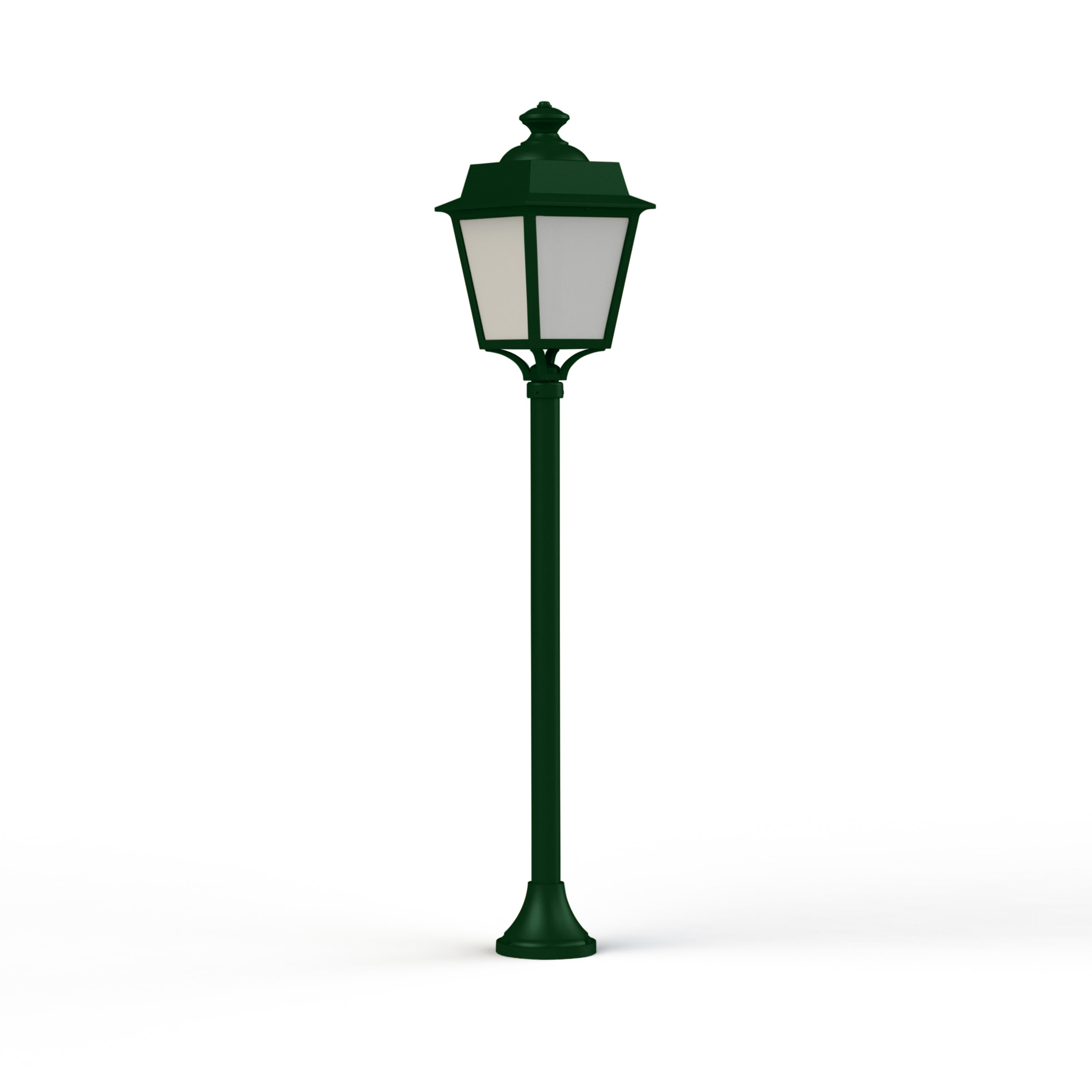Borne PLACE DES VOSGES EVOLUTION en aluminium, hauteur 1180mm, E27, IP65, classe 1, bloc diffuseur méthacrylate opale. Teinte RAL 6009 Vert sapin 067. Garantie 25 ans anticorrosion sur l'aluminium