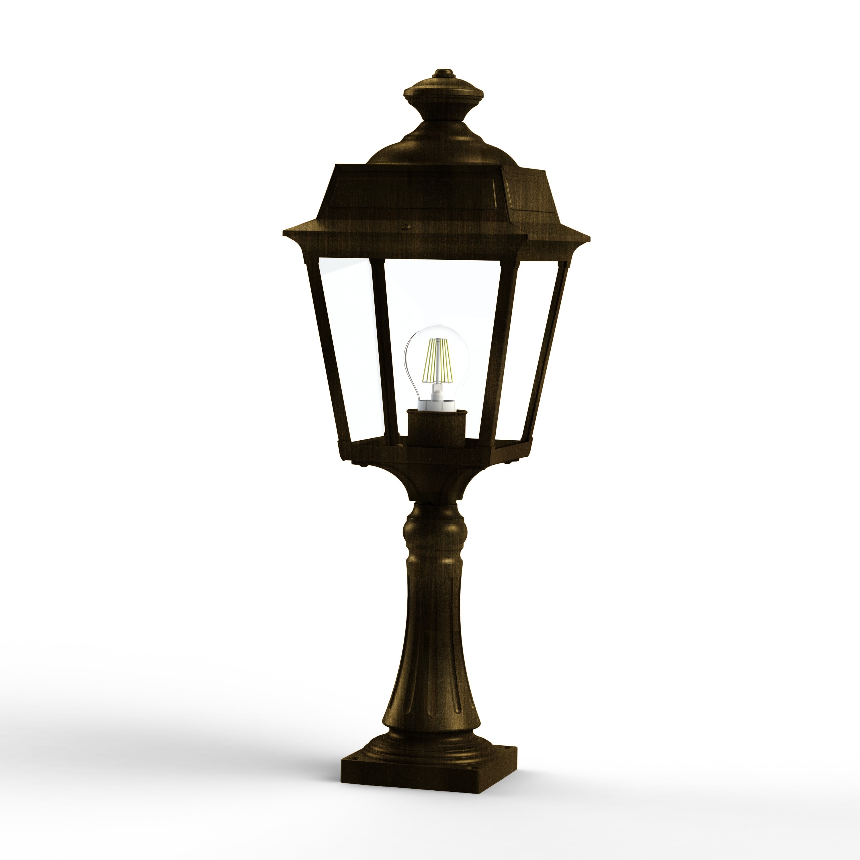 Borne PLACE DES VOSGES TRADITION en aluminium, hauteur 616mm, E27, IP44, classe 1, diffuseurs verre clair. Finition Patine dorée 009. Garantie 25 ans anticorrosion sur l'aluminium