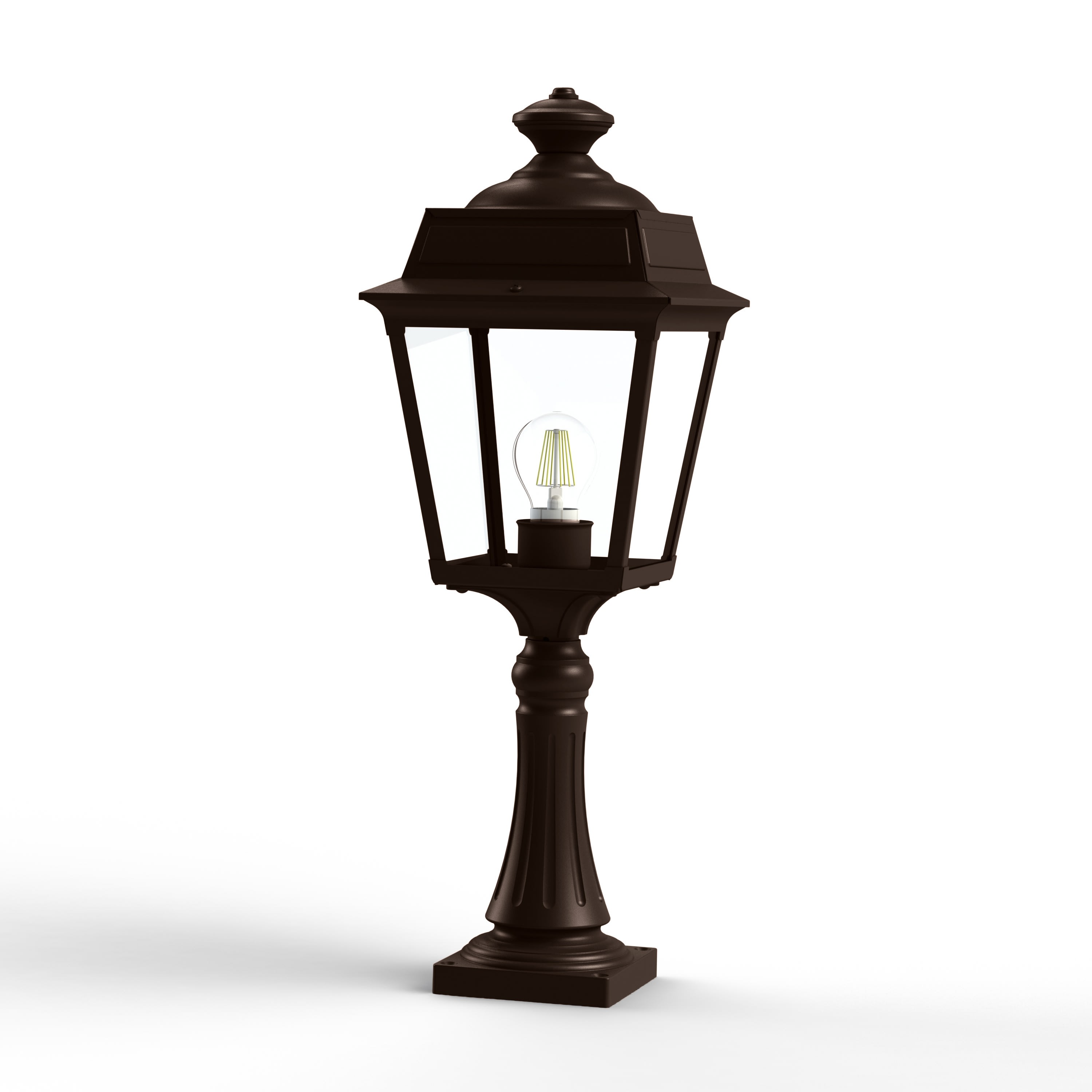 Borne PLACE DES VOSGES TRADITION en aluminium, hauteur 616mm, E27, IP44, classe 1, diffuseurs verre clair. Teinte Rouille 046. Garantie 25 ans anticorrosion sur l'aluminium
