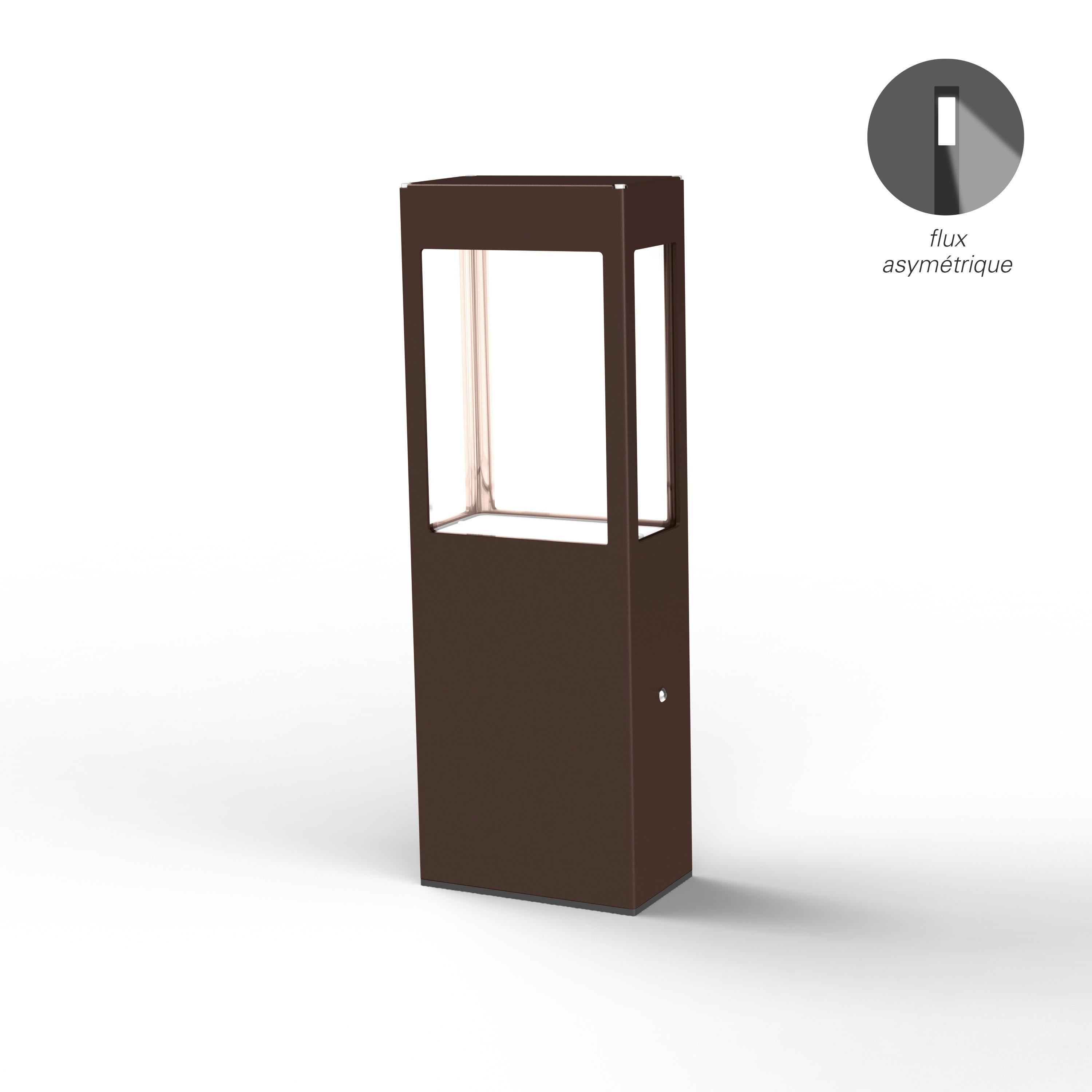 Borne TETRA en aluminium, h=500mm, LED 12W asymétrique 2700°K intégrée, IP65, IK10, classe 1, diffuseur polycarbonate clair. Teinte Rouille 046. Garantie 25 ans anticorrosion sur l'aluminium