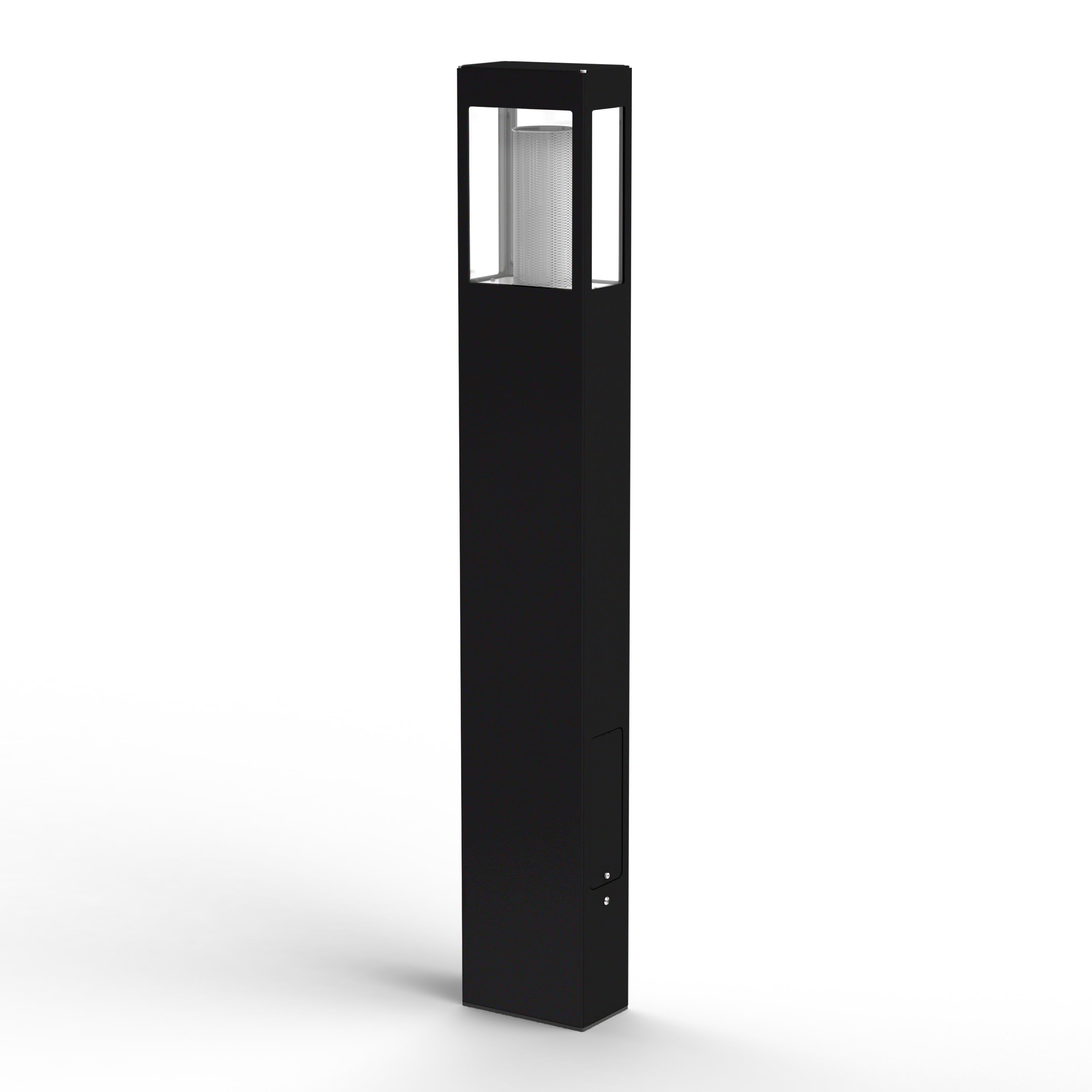 Borne TETRA en aluminium, h=1100mm, E27, IP65, IK10, classe 3, diffuseur polycarbonate clair, paralume inox. Teinte RAL 9005 Noir foncé 000. Garantie 25 ans anticorrosion sur l'aluminium