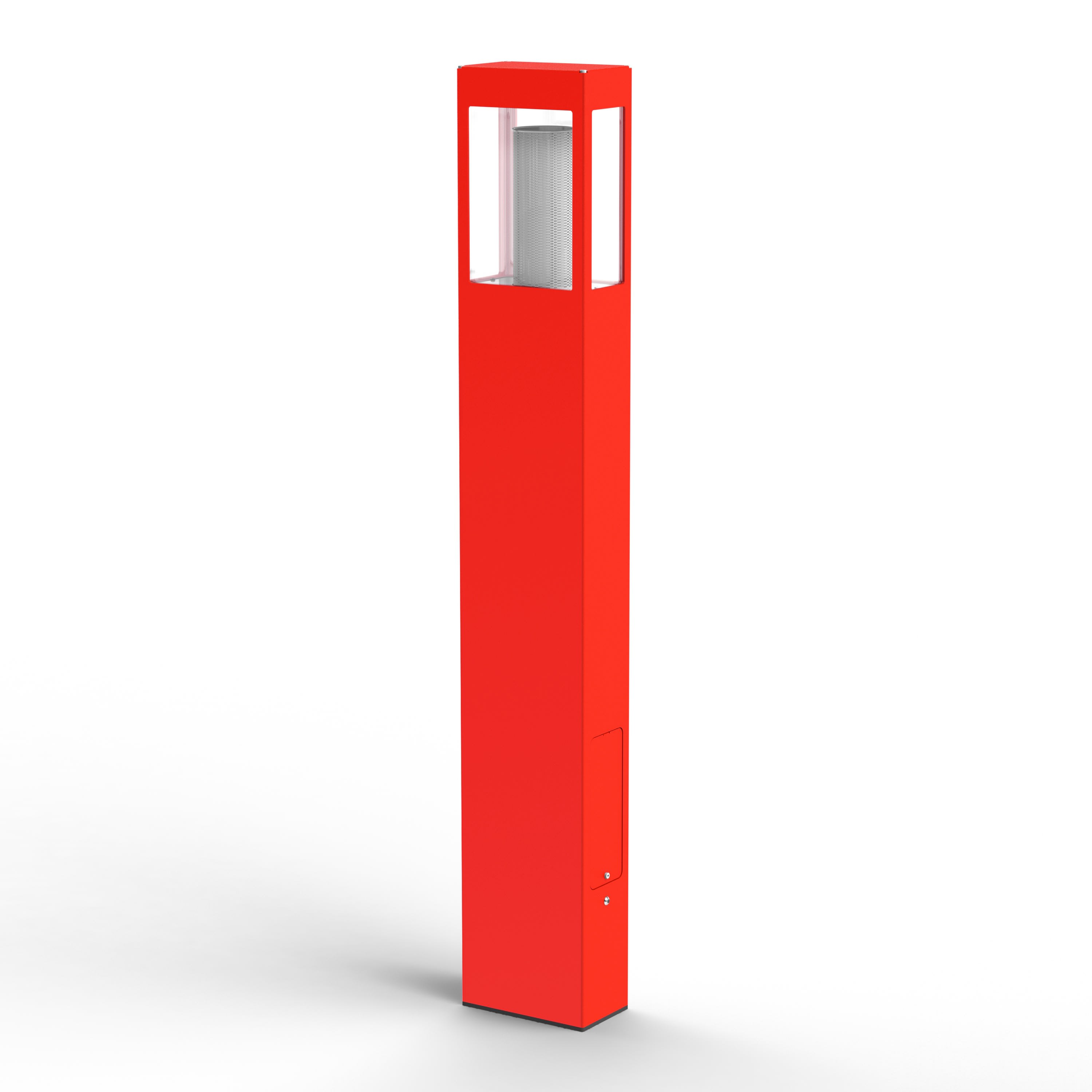 Borne TETRA en aluminium, h=1100mm, E27, IP65, IK10, classe 3, diffuseur polycarbonate clair, paralume inox. Teinte RAL 3020 Rouge signalisation 056. Garantie 25 ans anticorrosion sur l'aluminium