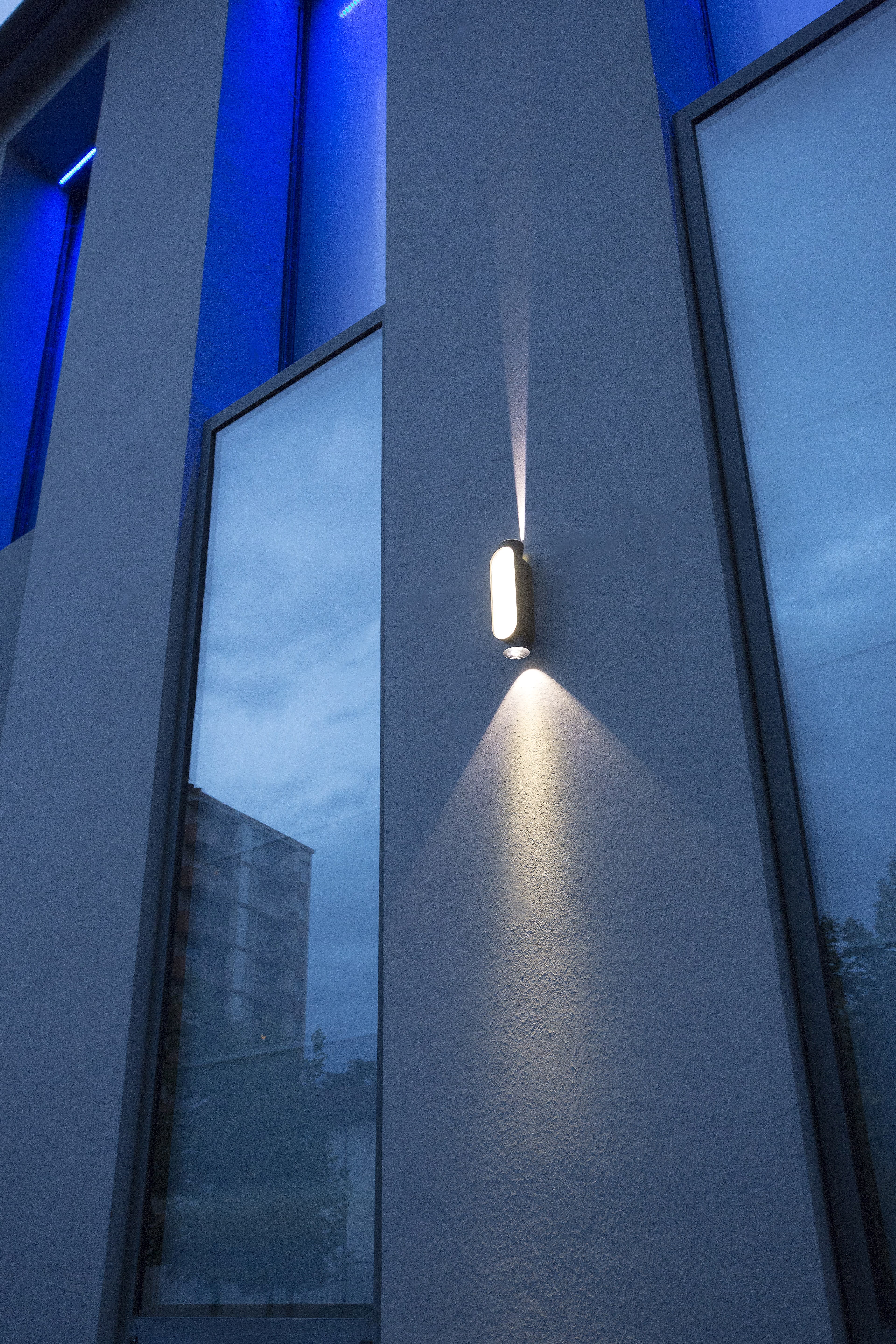 Applique IBUK en aluminium, LED 3x4,5W 4300°K, éclairage haut et bas 10°-10°, IP65, IK10, Classe 2, diffuseurs polycarbonate clair. Façade blanche rétroéclairée. Teinte Bleu 111. Garantie 25 ans anticorrosion sur aluminium