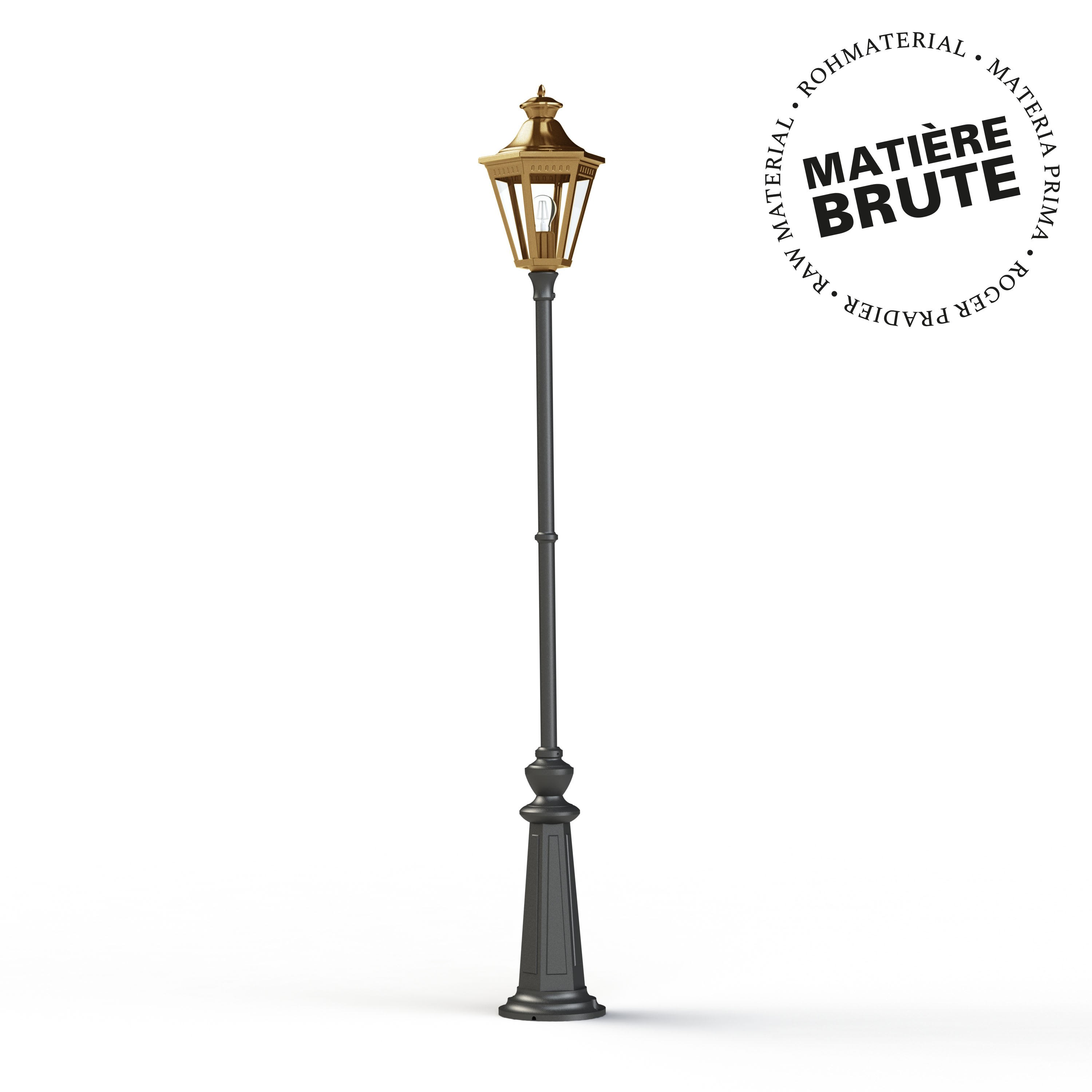 Lampadaire 1 tête VICTORIA, E27, IP44, classe 1, diffuseurs polycarbonate clair. Matière lanterne: Laiton brut 072 - Matière mât: Aluminium: Teinte RAL 9005 Noir foncé 000