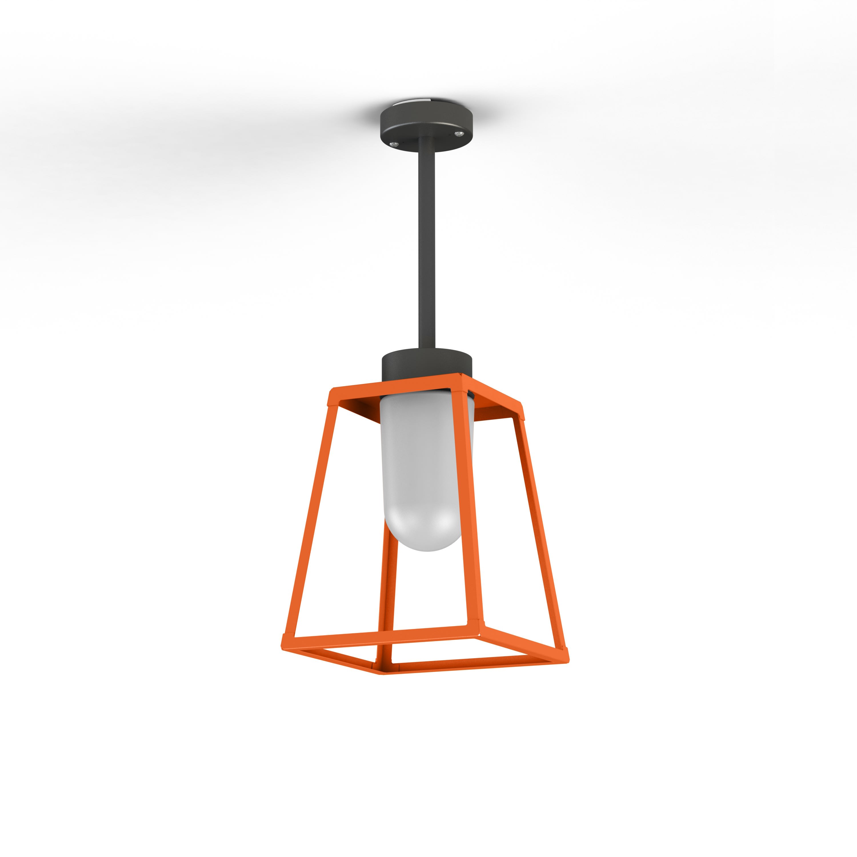 Suspension rigide LAMPIOK 1 en aluminium, E27, IP65, classe 2, diffuseur verre dépoli. Cage : teinte RAL 2004 Orangé pur 014. Tige suspension : teinte RAL 7021 Gris noir 107. Garantie 25 ans anticorrosion sur l'aluminium.