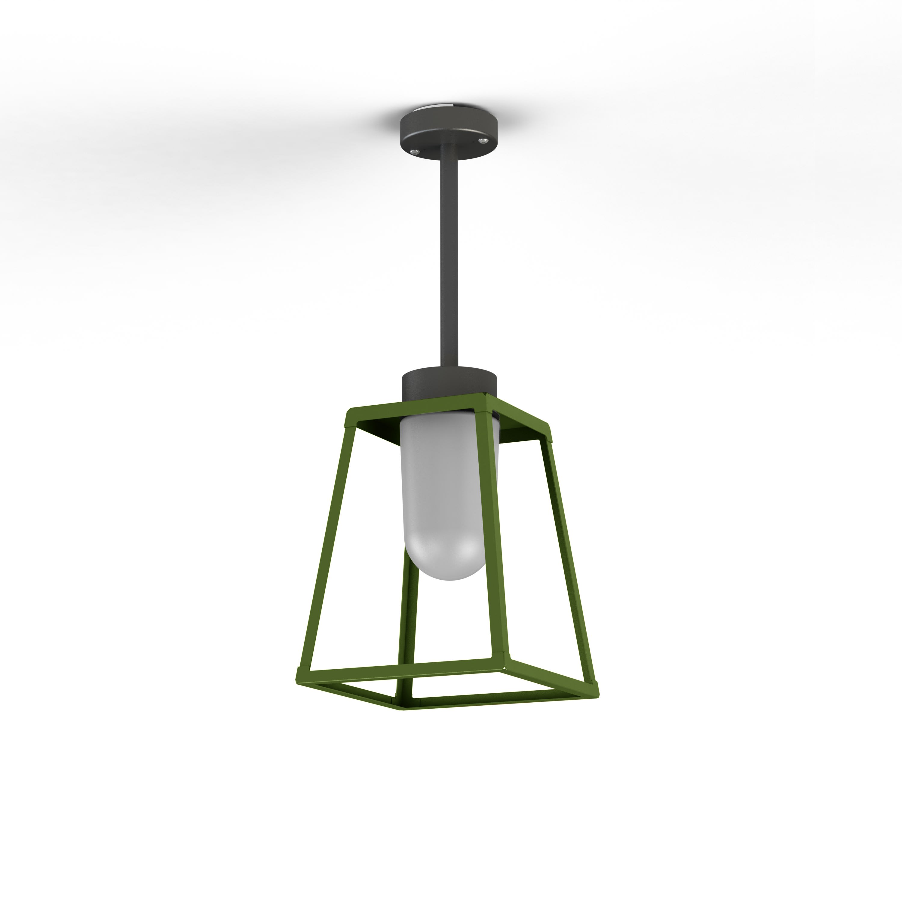 Suspension rigide LAMPIOK 1 en aluminium, E27, IP65, classe 2, diffuseur verre dépoli. Cage : teinte RAL 6025 Vert fougère 109. Tige suspension : teinte RAL 7021 Gris noir 107. Garantie 25 ans anticorrosion sur l'aluminium