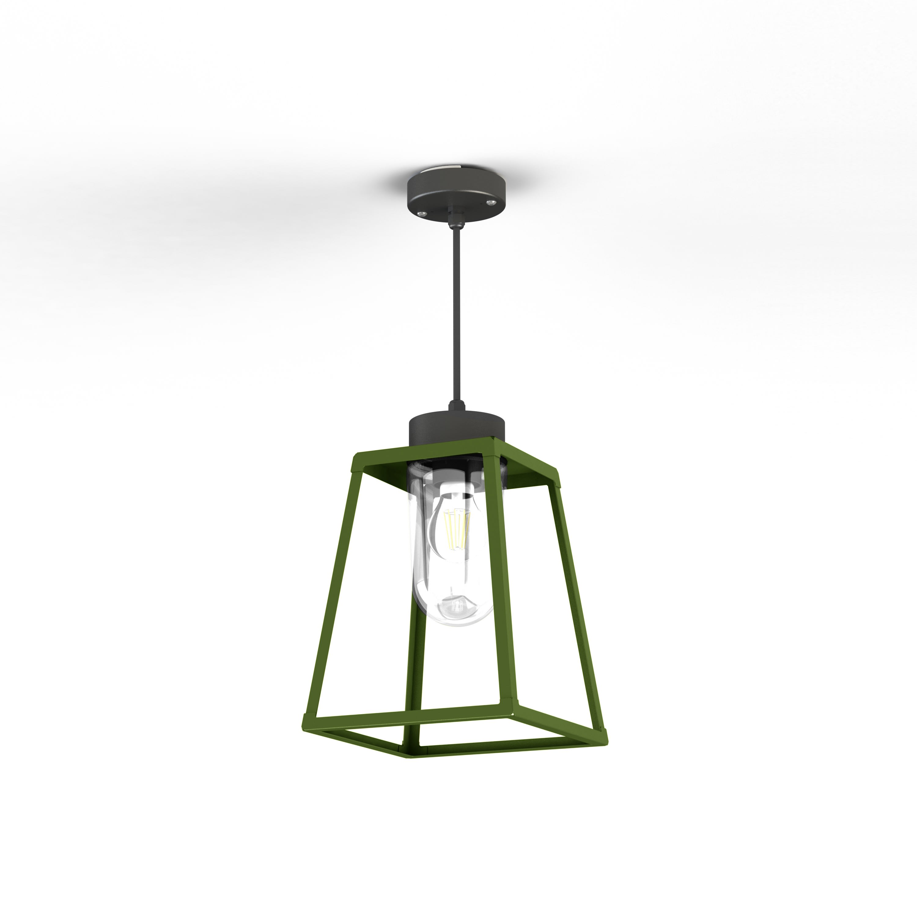 Suspension câble LAMPIOK 1 en aluminium, hauteur 880mm, E27, IP65, classe 2, diffuseur verre clair. Cage : teinte RAL 6025 Vert fougère 109. Coupelles : teinte RAL 7021 Gris noir 107. Garantie 25 ans anticorrosion sur l'aluminium