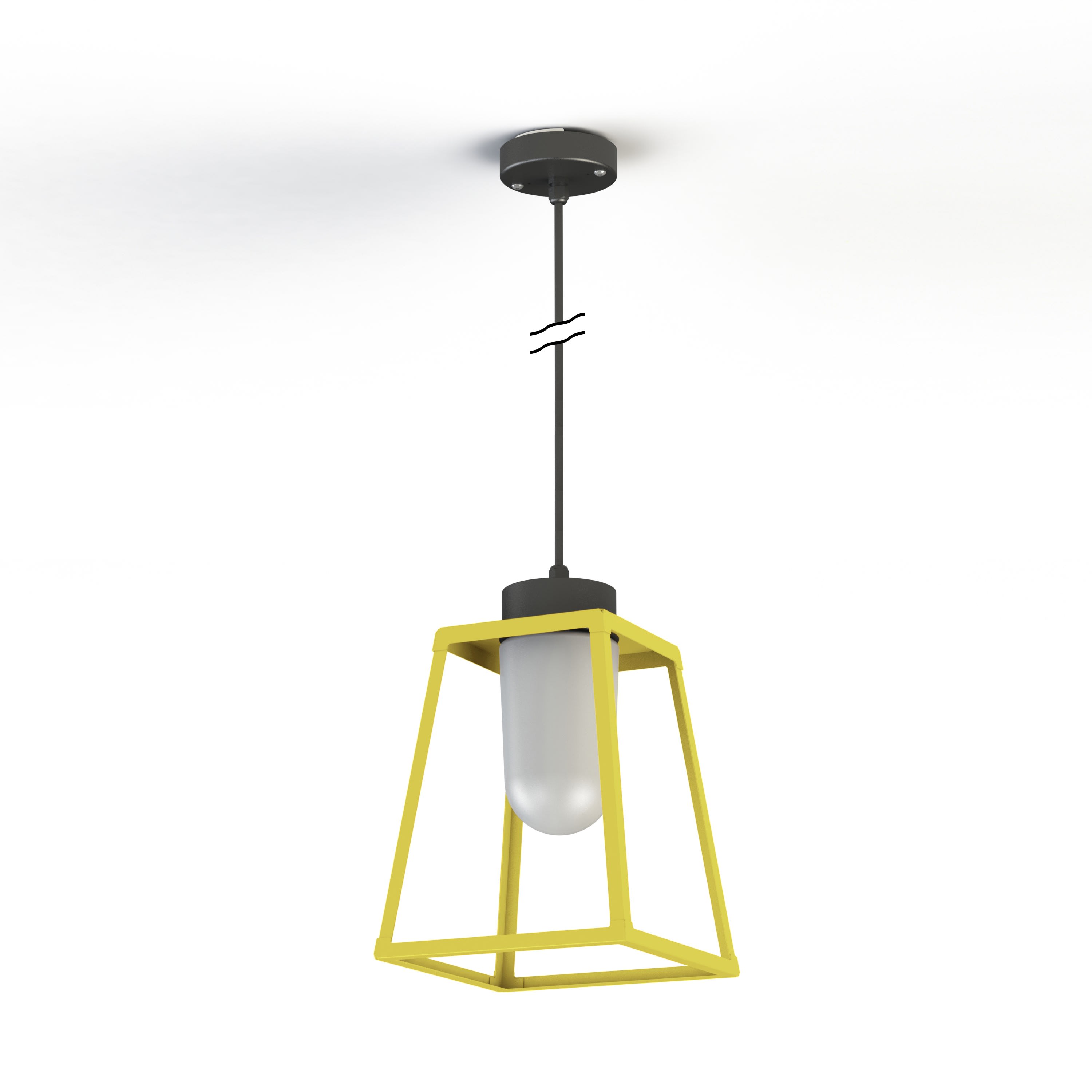 Suspension câble LAMPIOK 1 en aluminium, hauteur 1280mm, E27, IP65, classe 2, diffuseur verre dépoli. Cage : teinte RAL 1016 Jaune soufre 068. Coupelles : teinte RAL 7021 Gris noir 107. Garantie 25 ans anticorrosion sur l'aluminium