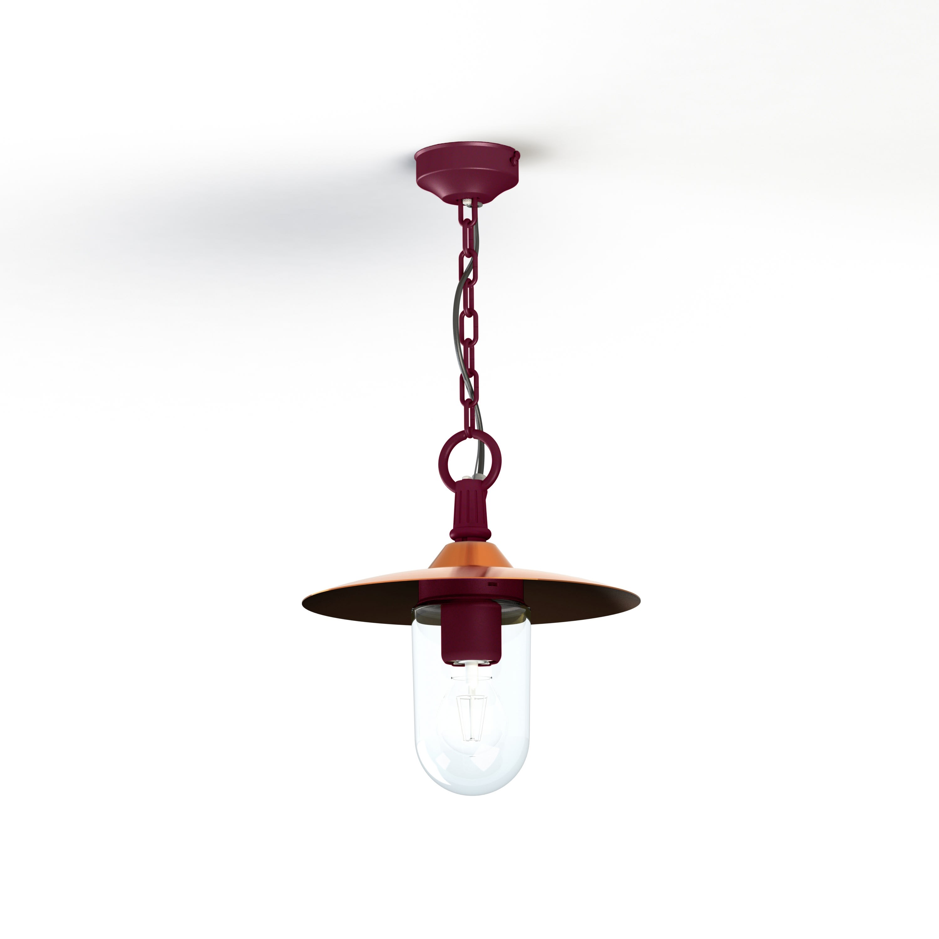 Suspension chaîne MONTANA, E27, IP44, classe 1, diffuseur verre clair. Chaîne en aluminium Teinte RAL 3005 Rouge vin 066, dôme en cuivre vernis