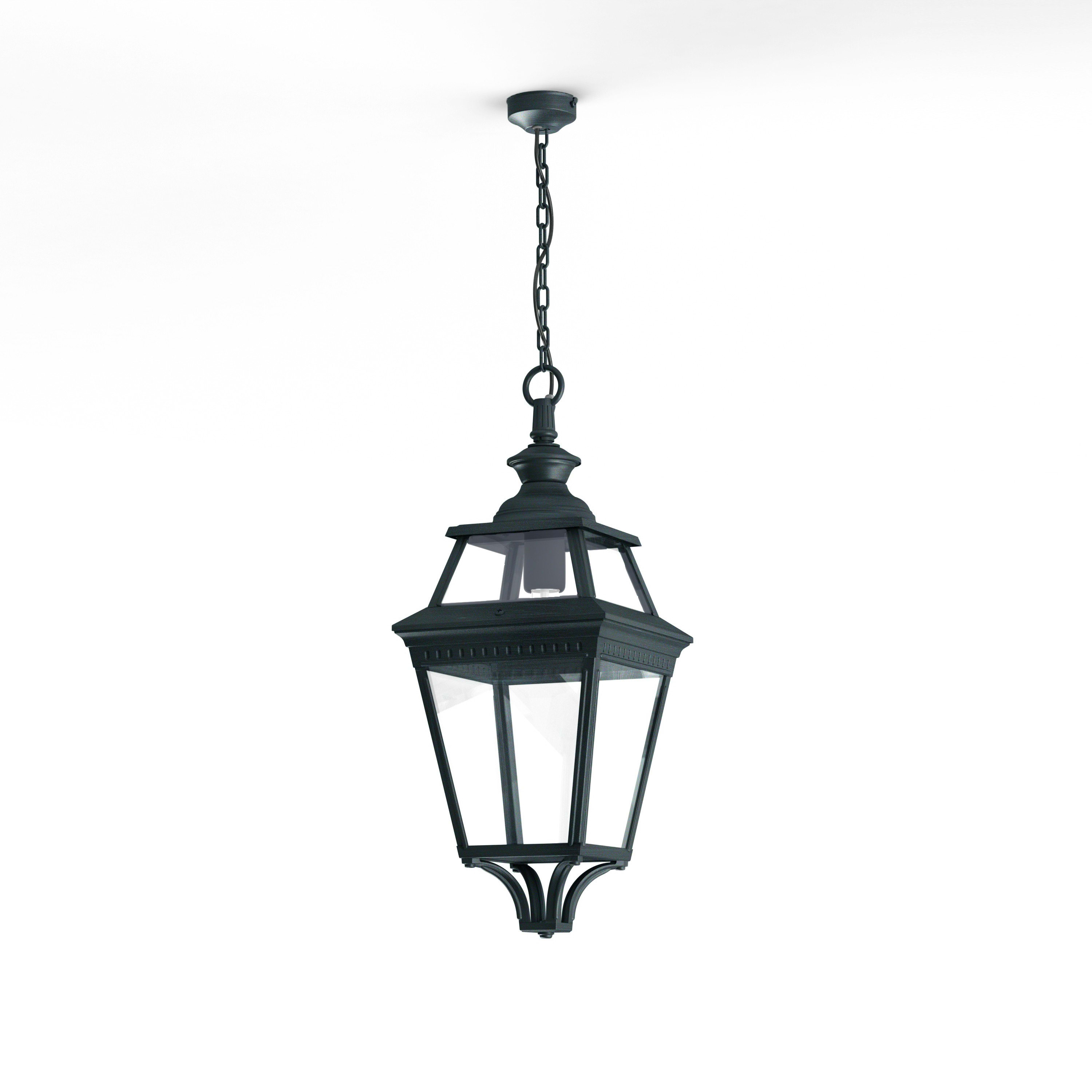 Suspension chaîne PLACE DES VOSGES 3 en aluminium, E27, IP44, classe 1, diffuseurs verre clair. Finition Patine vert de gris 008. Garantie 25 ans anticorrosion sur l'aluminium