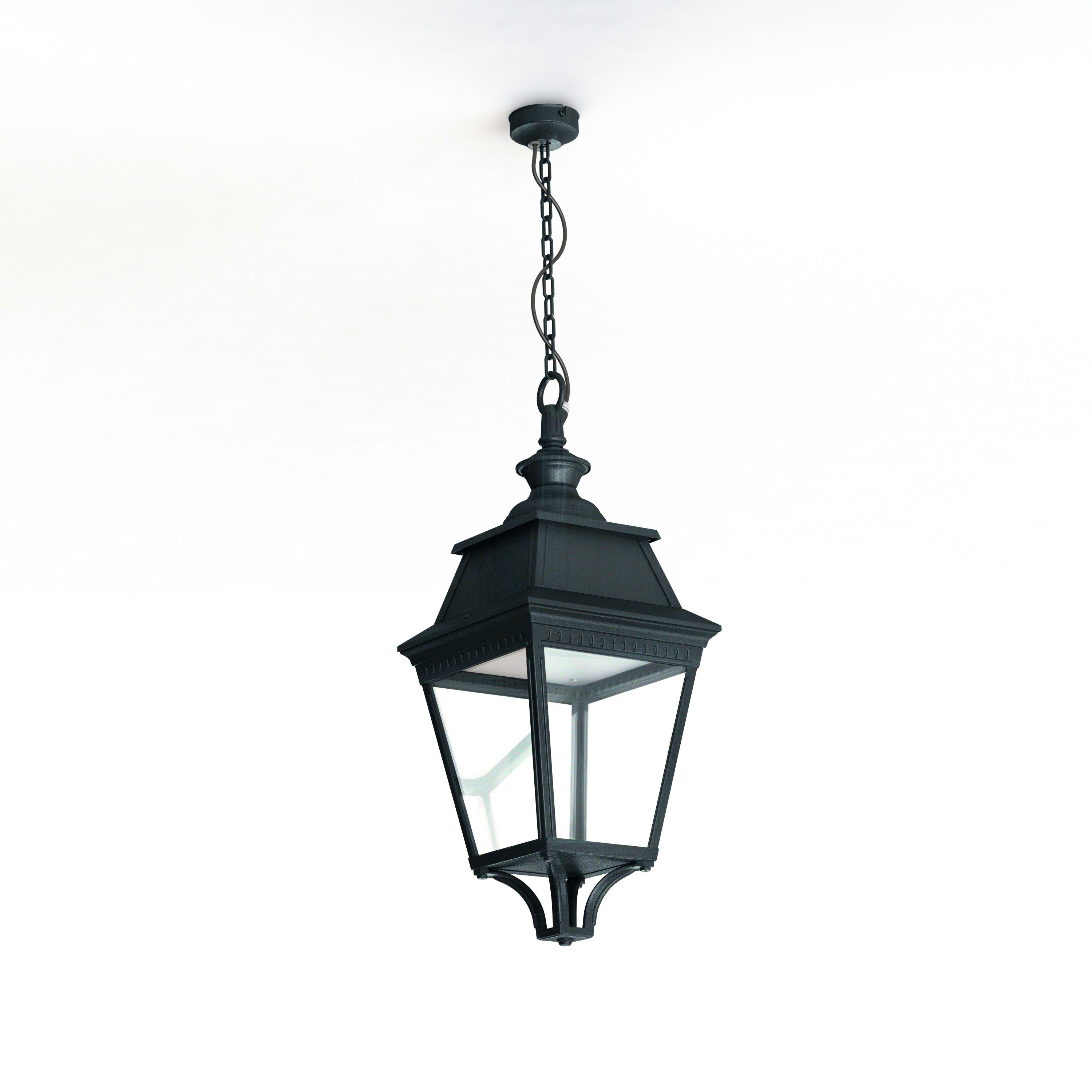 Suspension chaîne AVENUE 3 en aluminium, LED 35W 2700°K, IP44, classe 1, diffuseur verre clair. Finition Patine vert de gris 008. Garantie 25 ans anticorrosion sur l'aluminium
