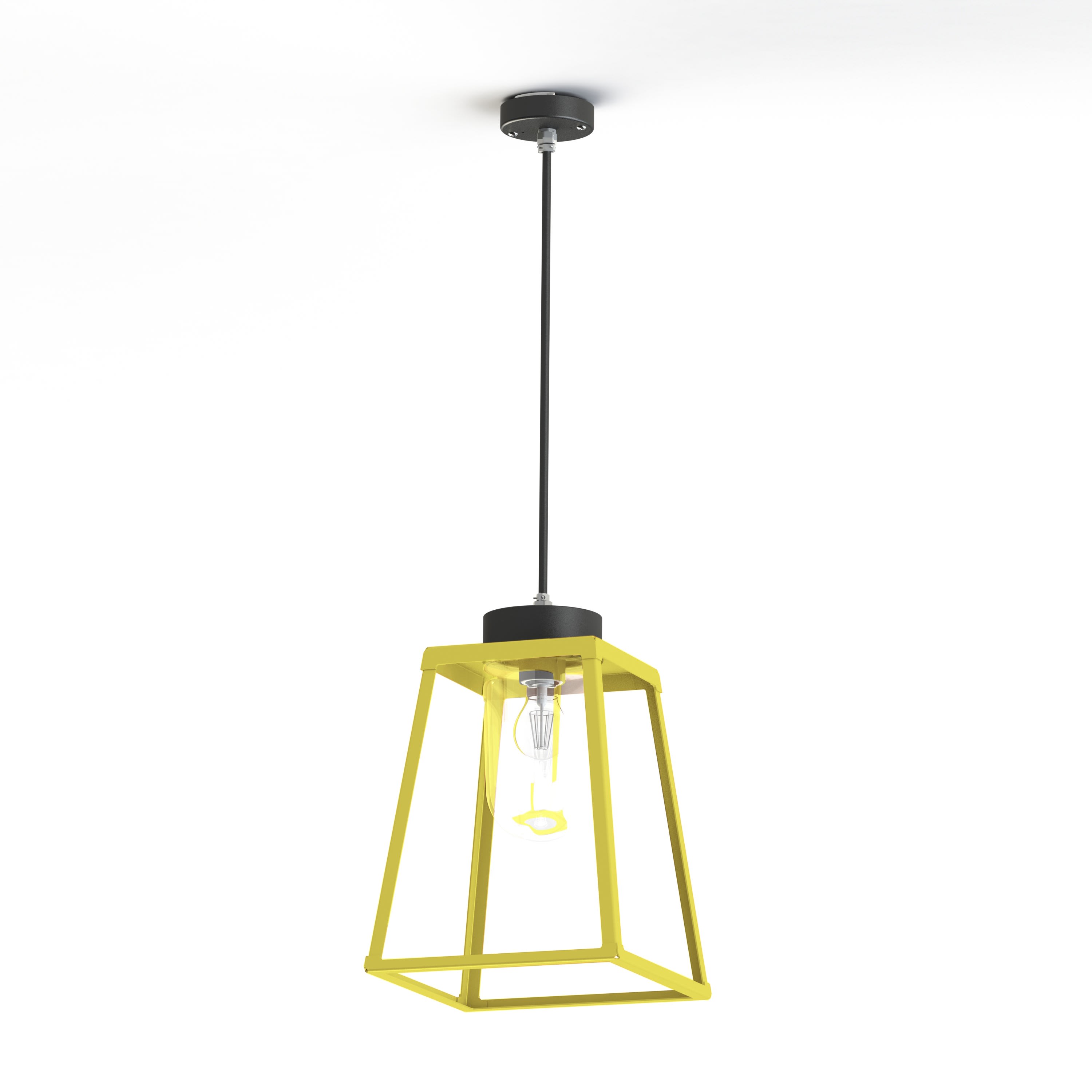 Suspension LAMPIOK 2 en aluminium, E27, IP65, classe 1, diffuseur verre clair. Cage : teinte RAL 1016 Jaune soufre 068. Coupelles : teinte RAL 7021 Gris noir 107. Garantie 25 ans anticorrosion sur l'aluminium