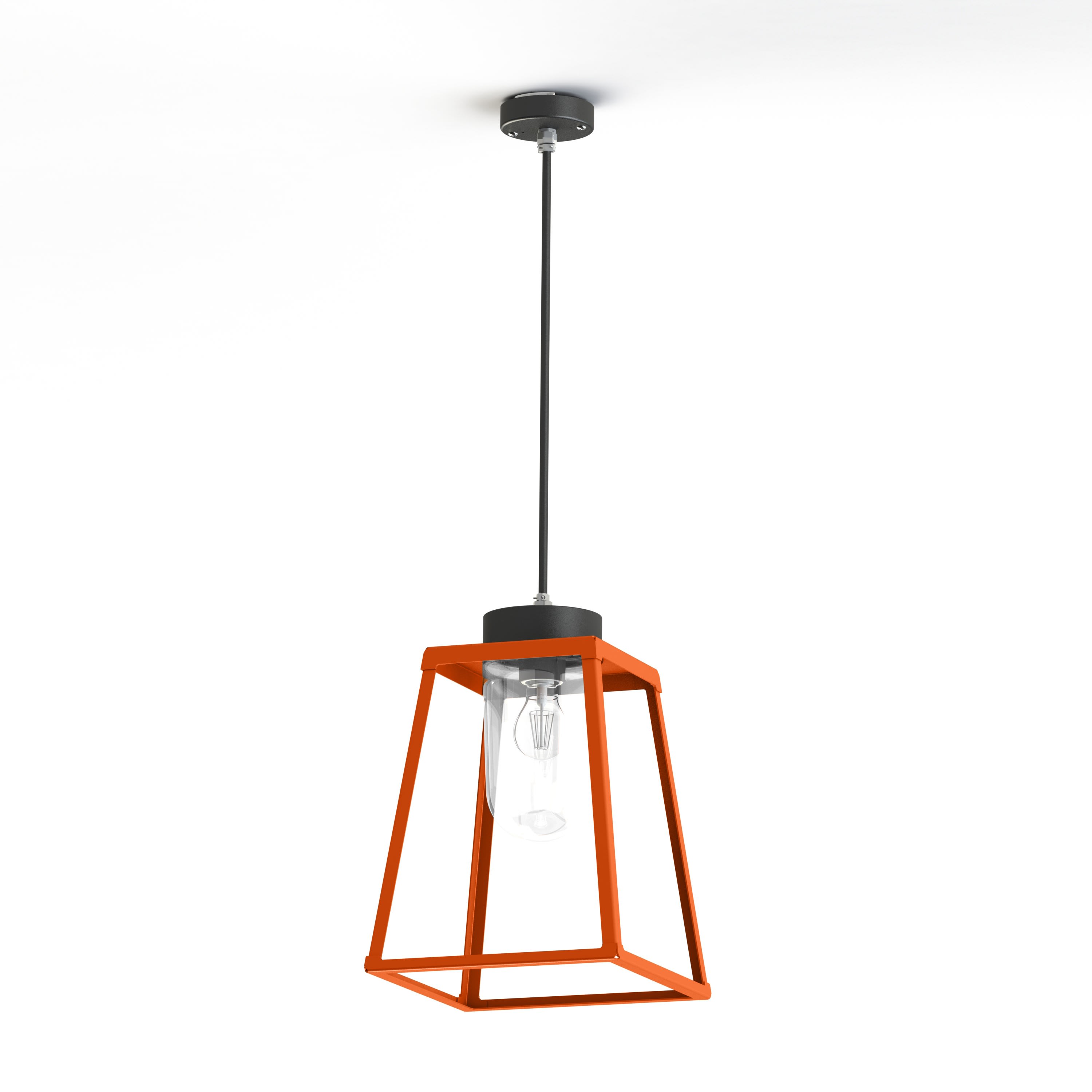 Suspension LAMPIOK 2 en aluminium, E27, IP65, classe 1, diffuseur verre clair. Cage : teinte RAL 2004 Orangé pur 014. Coupelles : teinte RAL 7021 Gris noir 107. Garantie 25 ans anticorrosion sur l'aluminium