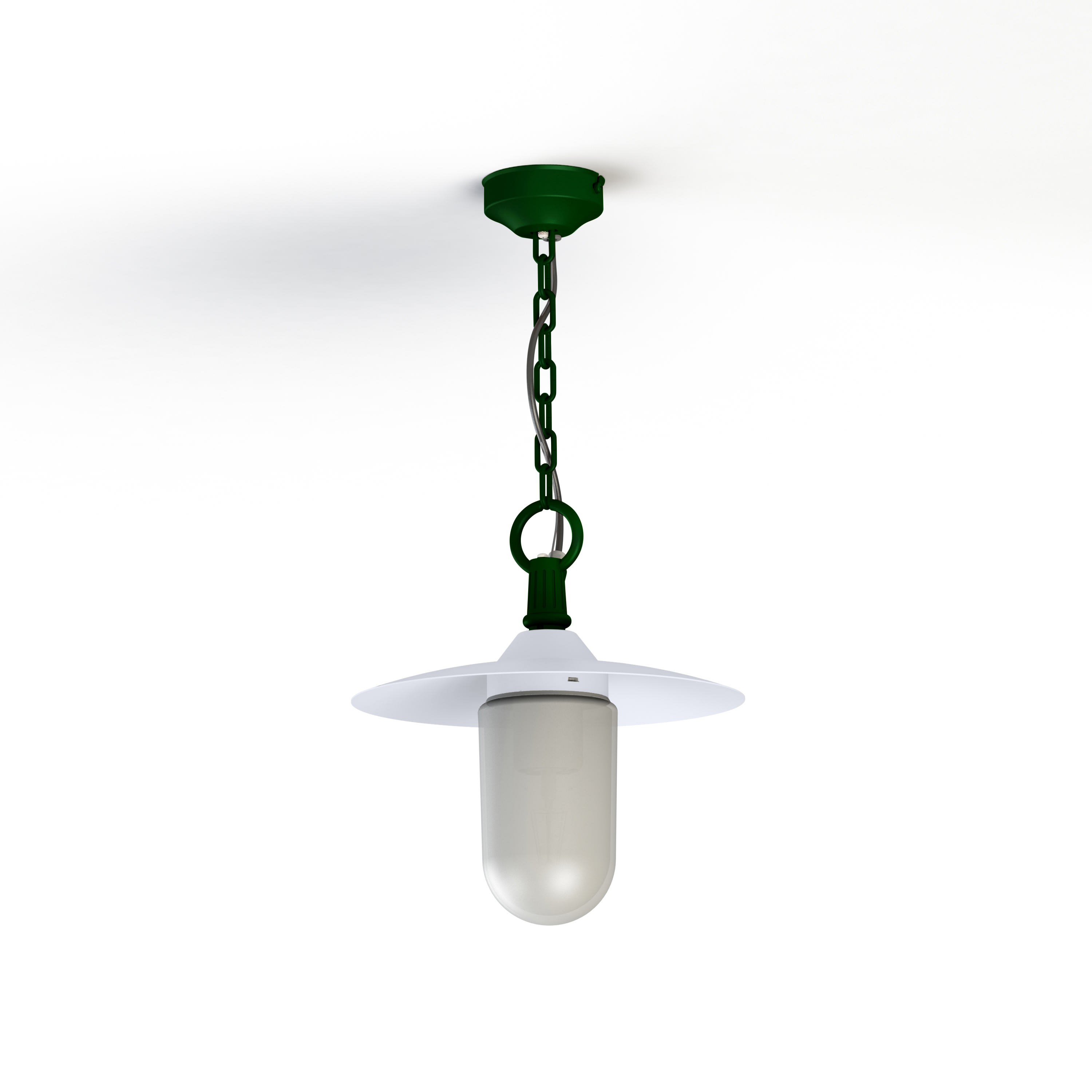 Suspension chaîne MONTANA en aluminium, E27, IP44, classe 1, diffuseur verre dépoli. Chaîne Teinte RAL 6009 Vert anglais 019, dôme blanc. Garantie 25 ans anticorrosion sur l'aluminium