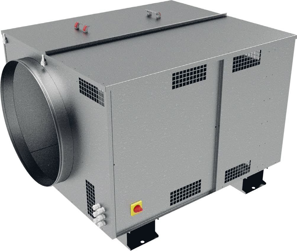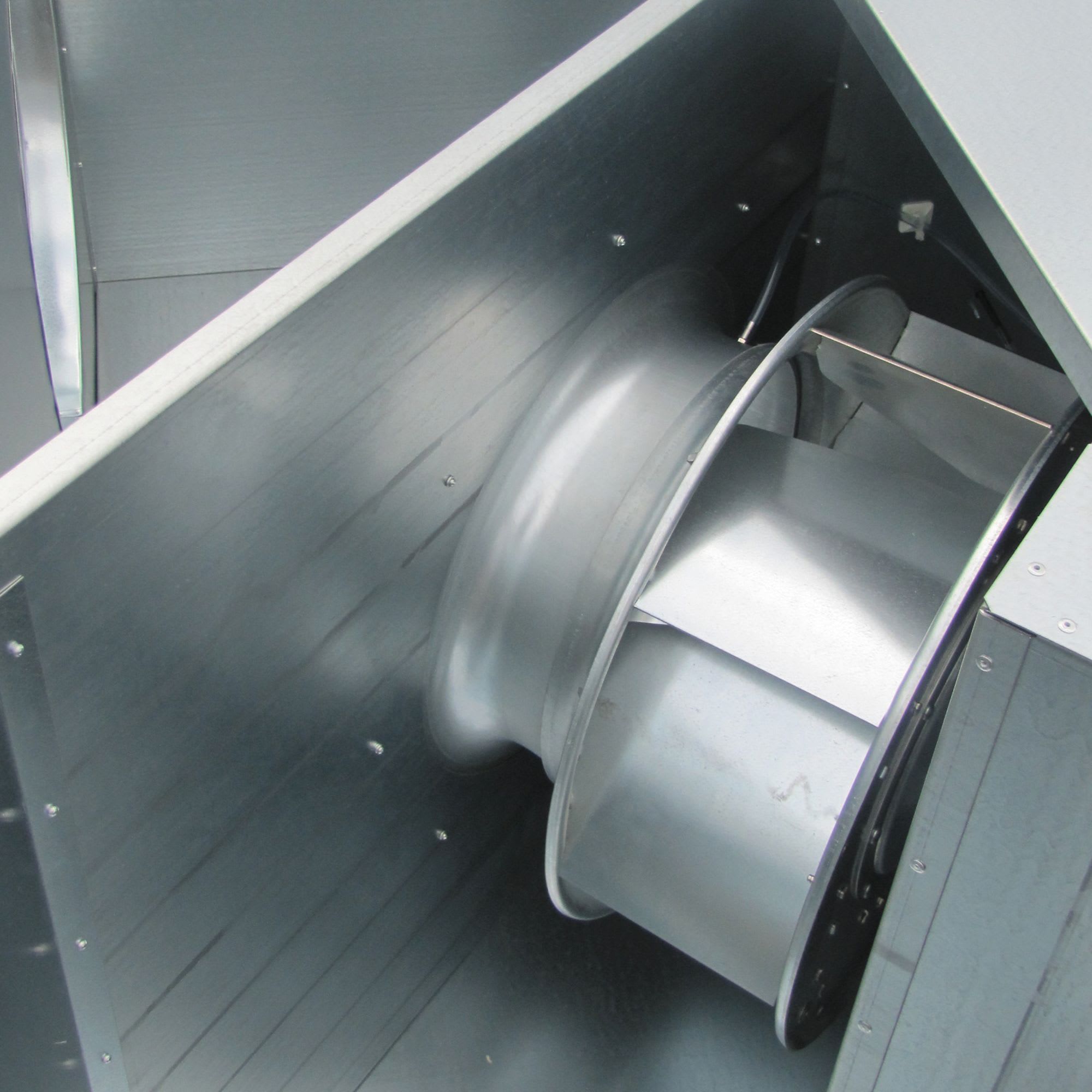Caisson de ventilation 400°C 1/2h (C4), très basse consommation, 4800 m3/h, refoulement horizontal double piquage, triphasé 400V