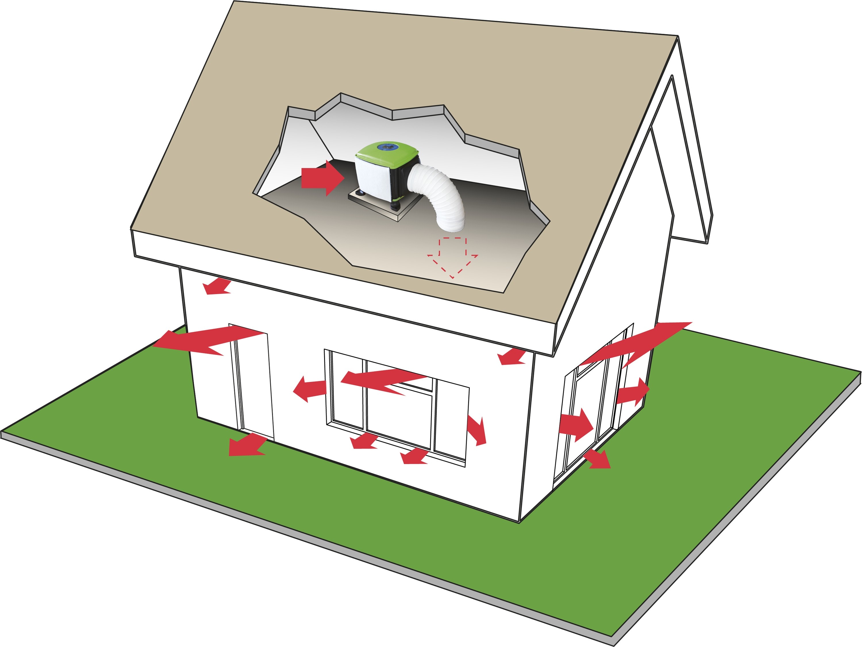 - Les polluants tels que l'humidité, le CO2 et les COV sont évacués naturellement par les défauts d'étanchéité du bâtiment. La surpression et le renouvellement d'air contribuent également à une forte diminution des concentrations de RADON.
