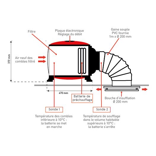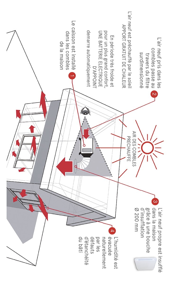 - L'air extérieur est naturellement préchauffé par le soleil dans les combles. En période très froide, pour un plus grand confort, une batterie électrique d'appoint démarre automatiquement.