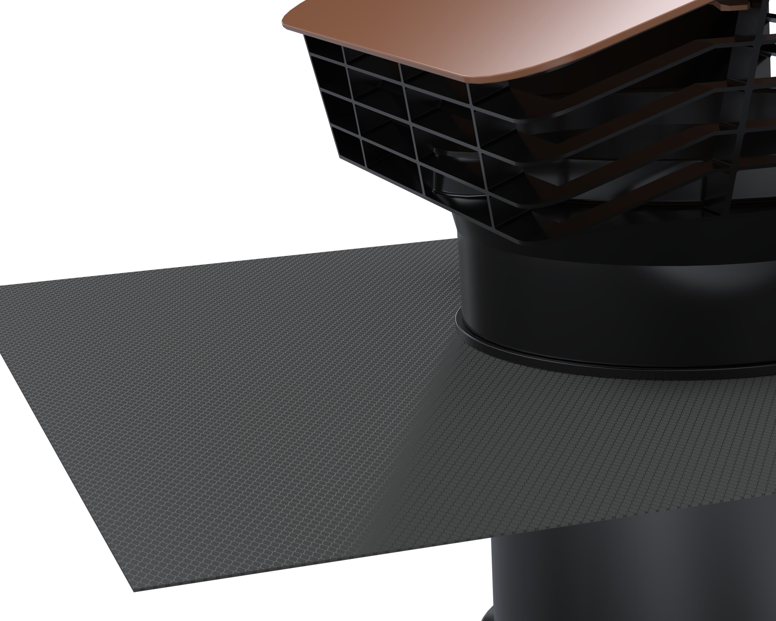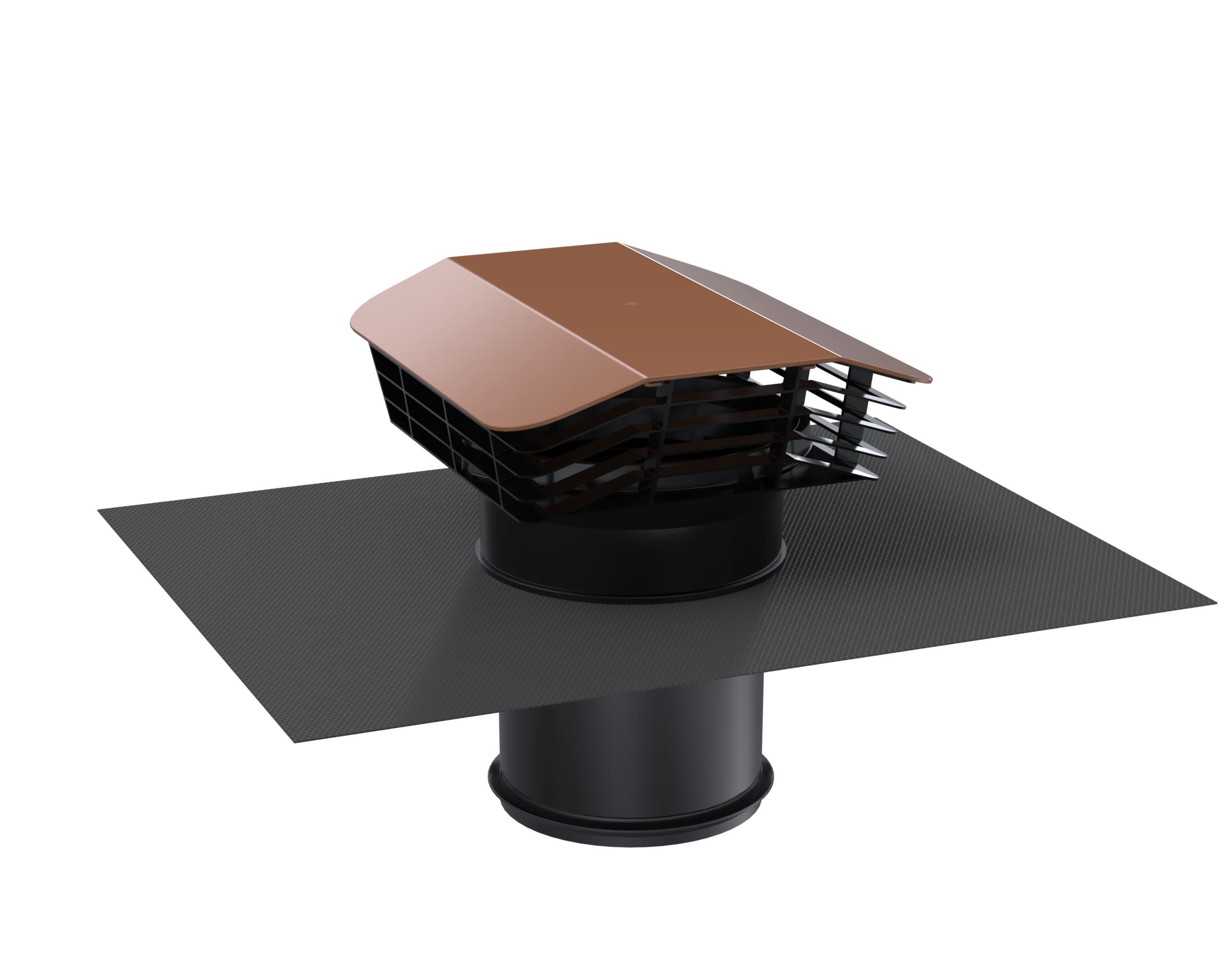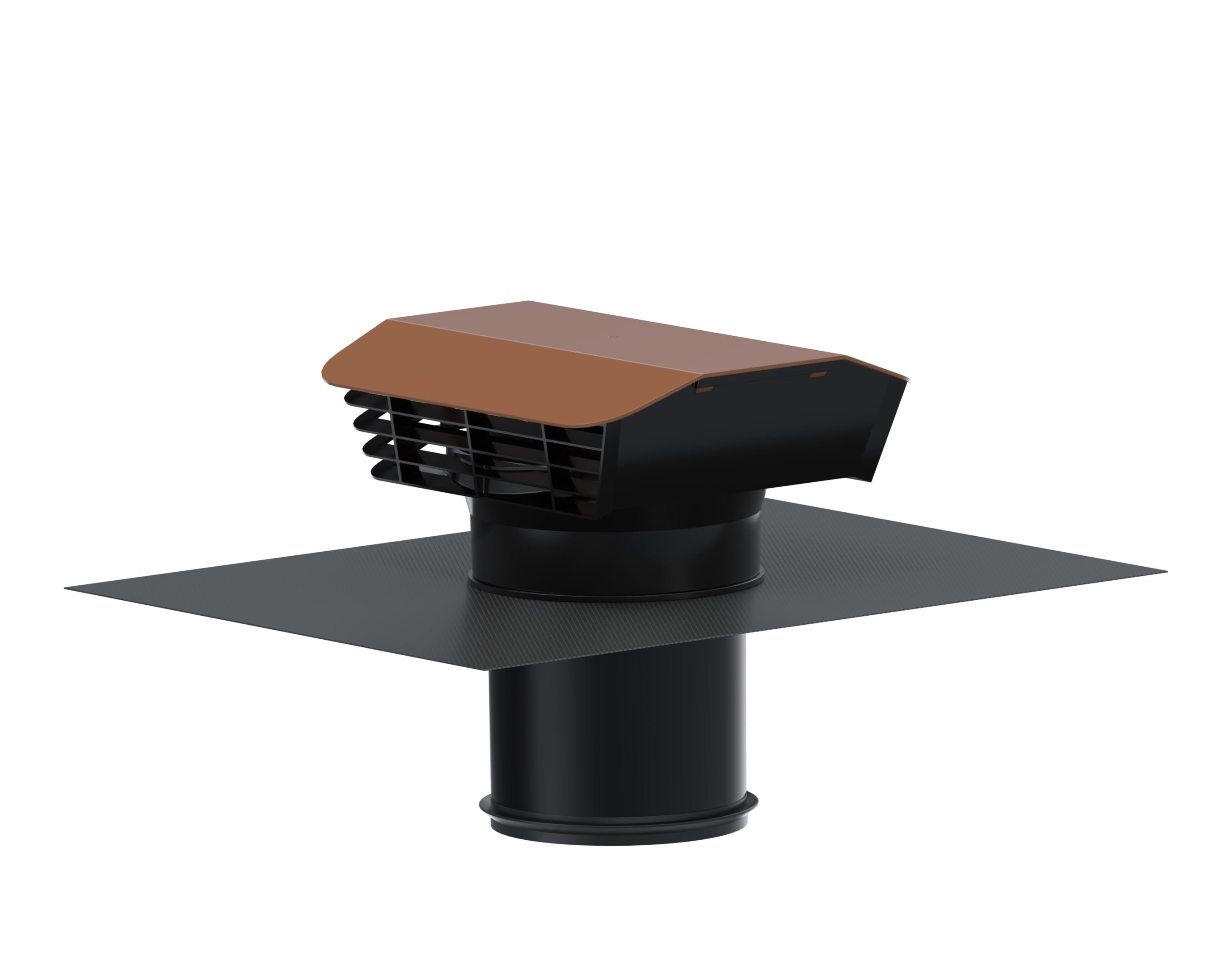 Chapeau toiture plastique, diamètre de raccordement 125 mm, rejet d'air 210 m3/h, prise d'air 320 m3/h, capot pare-pluie en plastique couleur tuile avec grille de protection. Abergement en résine, maléable. Ne contient pas de plomb.