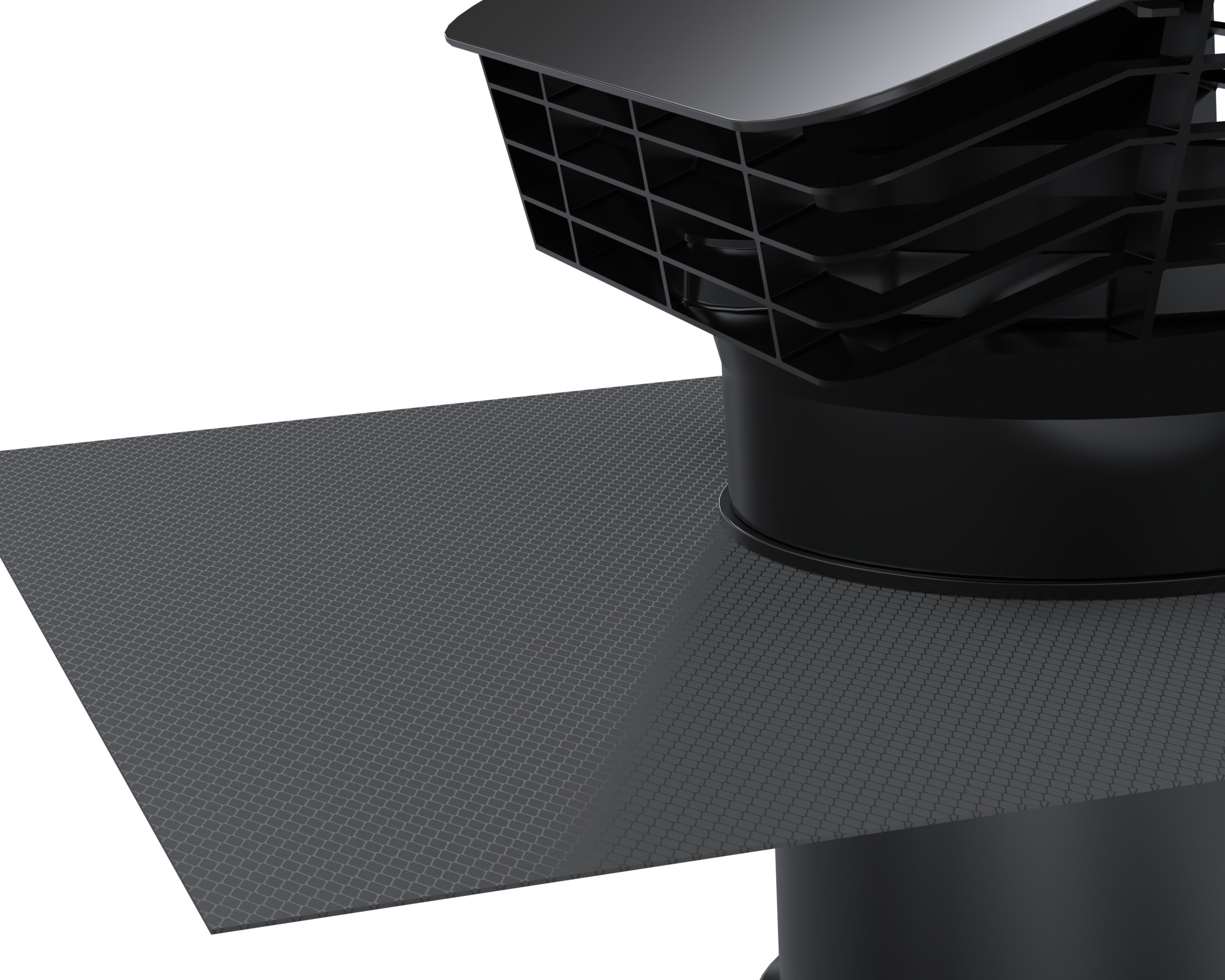 Chapeau toiture plastique, diamètre de raccordement 150/160 mm, rejet d'air 350 m3/h, prise d'air 360 m3/h, capot pare-pluie en plastique couleur ardoise avec grille de protection. Abergement en résine, maléable. Ne contient pas de plomb.