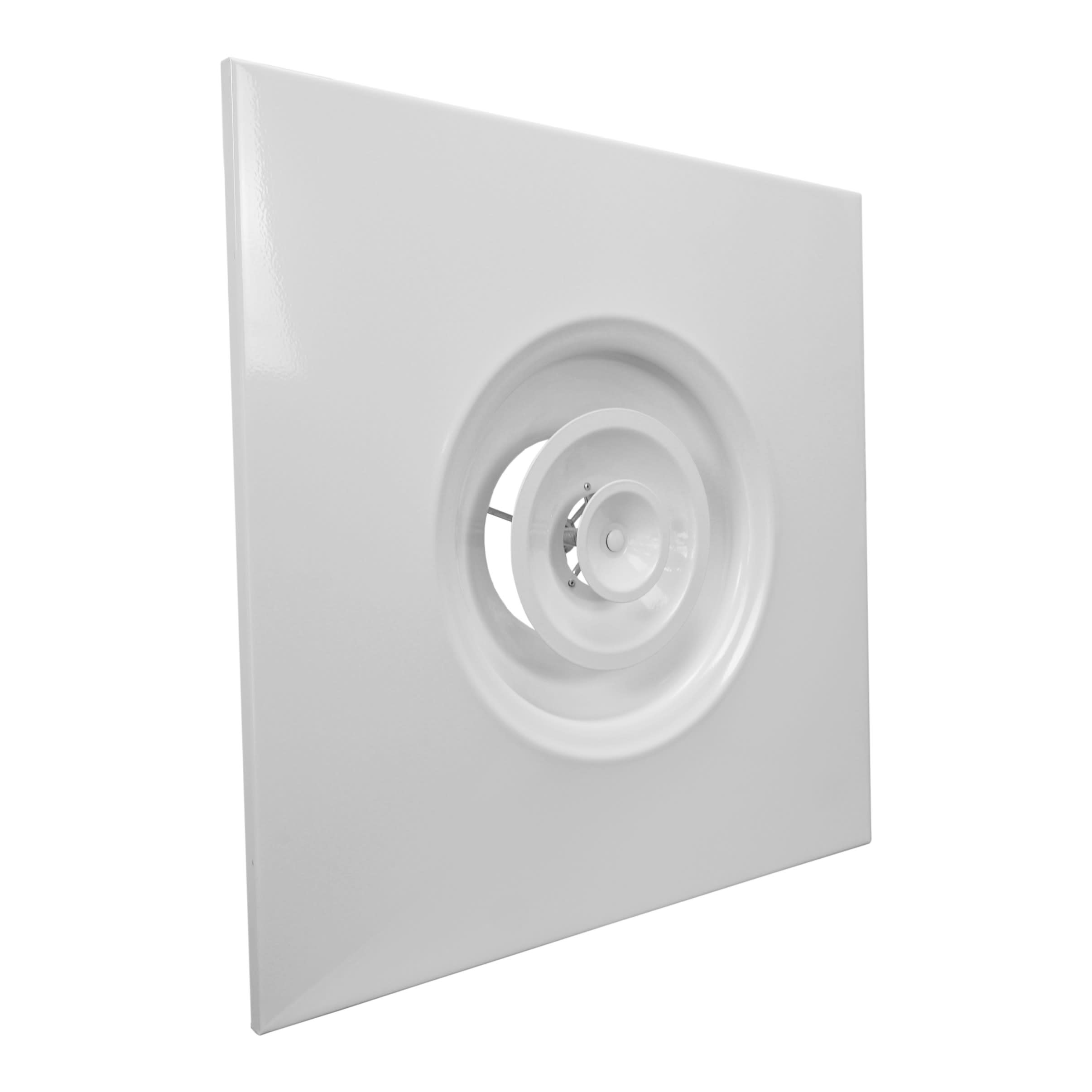 Diffuseur circulaire aluminium jet réglable avec plaques 600x600mm acier pour dalle de faux plafond, blanc, débits de 700 à 1250m3/h, réglage précis de la direction et de la portée du jet d'air (vis sans fin), diamètre de raccordement 315mm
