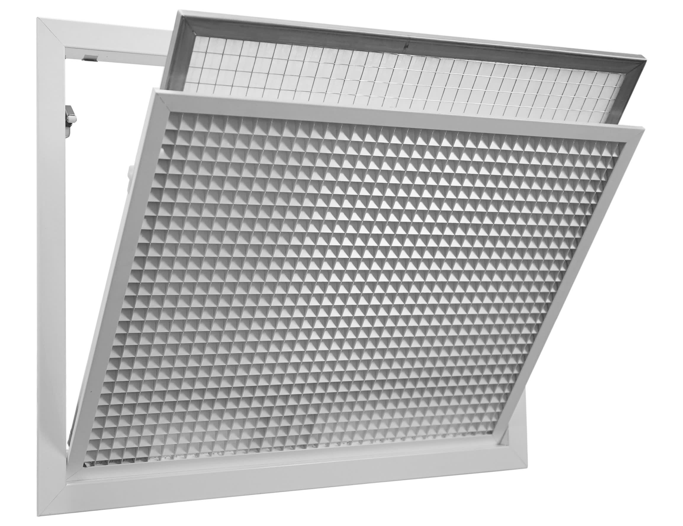 Grille de reprise à mailles inclinées et filtre démontable, RAL 9016 (blanc), débits de 900 à 1500 m3/h, dimensions 500 x 400 mm