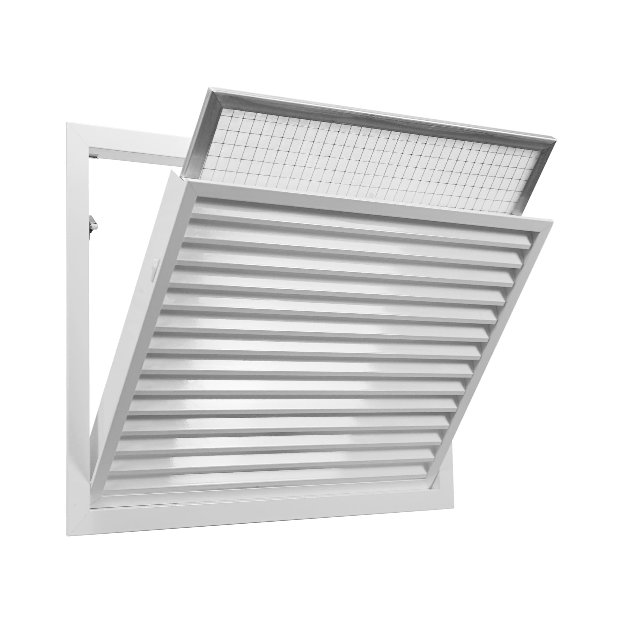 Grille de reprise à ailettes inclinées (pas de 25 mm) pour l'intérieur avec porte filtre et filtre, aluminium blanc, dimensions 600 x 200 mm