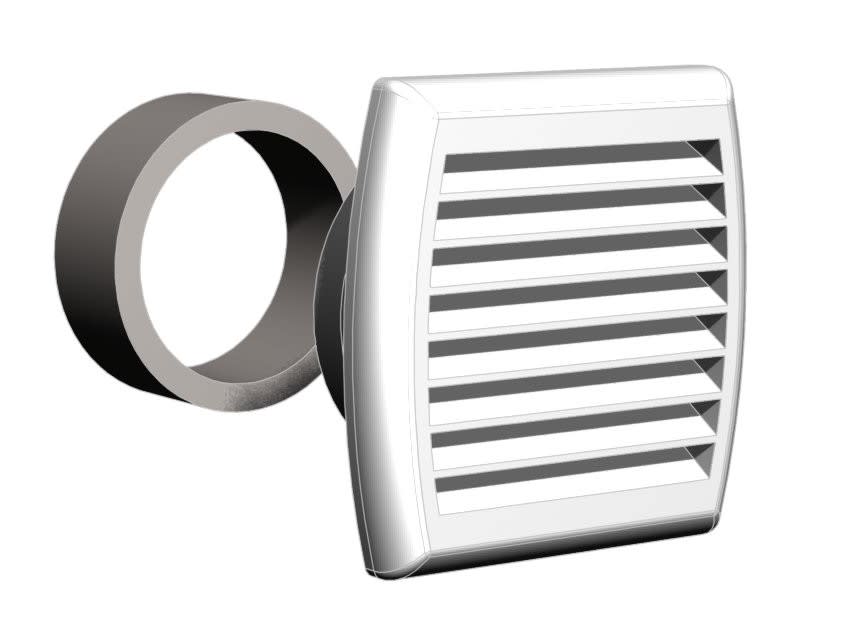 Kit entrée d'air hygroréglable acoustique murale, isolation par l'extérieur, de 6 à 45 m3/h sur une plage de pression de 20 Pa, diamètre de perçage 125mm. Comprends l'entrée d'air EM HY + manchon acoustique + manchon tôle + grille de façade