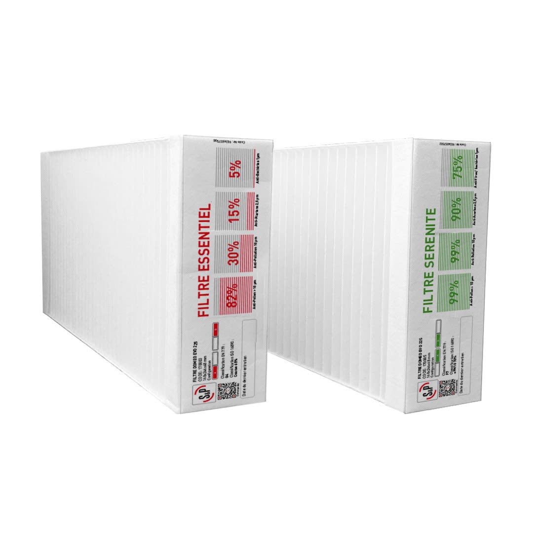 Kit filtres DOMEO EVO SERENITE pour absorption des grosses particules (bactéries, champignons, pollen, poussières fines, nanoparticules, virus...). F7 insufflation, G4 extraction. Assure votre QAI, limite la consommation de votre VMC.