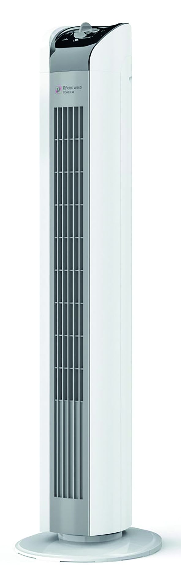 Tour de ventilation 3 vitesses. Colonne oscillante. Boutons de commande sur tête de colonne. Vitesse d'air 2,1 m/s. Débit d'air 790 m3/h. Niveau sonore 49 dB(A)