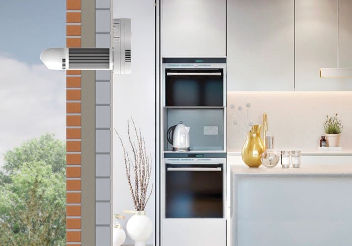 Ventilation double-flux tubulaire décentralisée, rendement 68%, extraction : 25/45 m3/h, insufflation 25/45 m3/h, D100 mm, longueur 310 mm, épaisseur du mur : mini 100 mm/maxi 310 mm