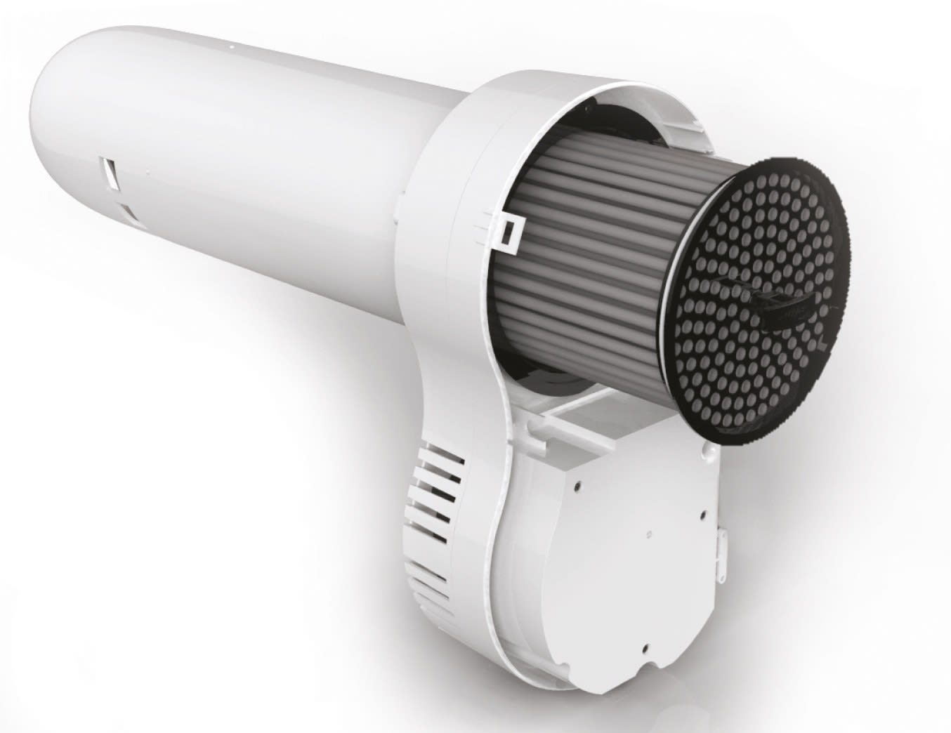Ventilation double-flux tubulaire décentralisée, rendement 75%, extraction : 25/45 m3/h, insufflation 25/45 m3/h, D150 mm, longueur 600 mm, épaisseur du mur : mini 501 mm/maxi 600 mm
