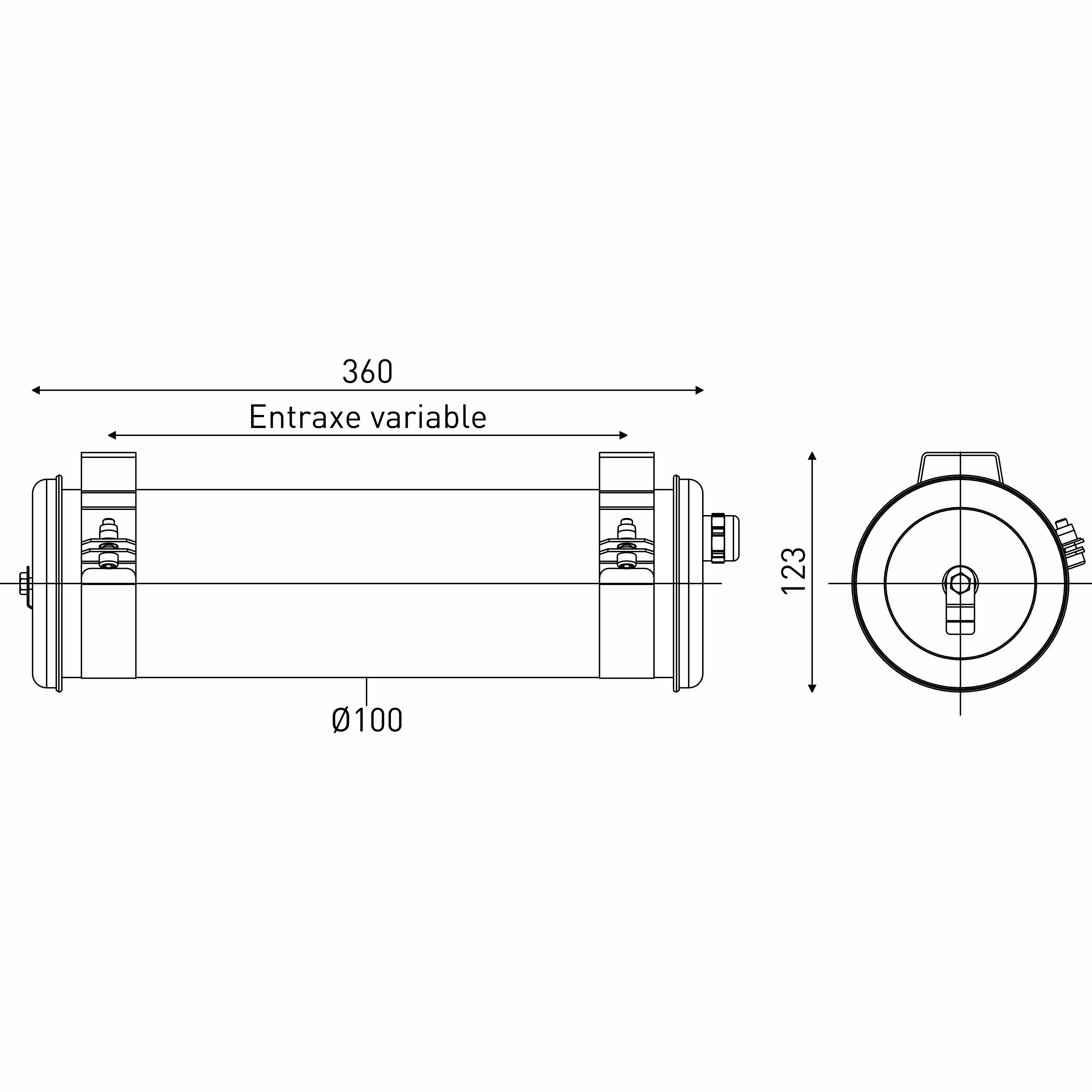 Applique tubulaire BELLEVILLE 100 360° (design : Normal Studio) - Pour éclairage omnidirectionnel avec grille à perforation base trapèze - Couleur : COAL (RAL 7021) - Grille finition COAL - Vasque : Coextrudé de polycarbonate/PMMA insensible aux UV pour un usage intérieur/extérieur - Flasques & Colliers : Inox 316L laqués COAL (RAL 7021) - Grille en aluminium laqué COAL (RAL 7021) insérée entre la vasque et un film interne en polycarbonate blanc opalisé - Toute partie métallique externe en inox 316L et visserie en inox A4 - Platine en inox solidaire du flasque d'entrée de câble - Joints : Joints moulés en EPDM - Avec 1 lampe filament LED E27 8W 2700K mate - Flux lumineux: 280 lm - Température de couleur: 2700 K - Gradation par un module CASAMBI intégré - Diamètre : 100 mm - Longueur hors tout: 355 mm - Entrée de câble par presse-étoupe en laiton nickelé pour câble Ø 5 à 14 mm - Fourni équipé de 0,50m de câble 3G1,5 avec tresse en cuivre étamé sous gaine transparente - Fixation par 2 colliers renforcés en inox à grenouillère (à entraxe variable) et permettant une orientation sur 360° - Fourni avec un boitier de sortie murale en inox 316L, usage intérieur (IP 40), à raccorder à la terre - Installation en position verticale, presse-étoupe vers le bas - Maintenance par desserrage de la vis de fermeture et extraction de la vasque - Garantie 5 ans - Température d’utilisation : -20 °C à +35 °C - Indice de protection : IP66/IP68/IP69K - Résistance aux chocs : IK10 - Classe électrique : Classe I - Alimentation : 220-240V 50/60Hz - Consommation: 8 W - Résistance au fil incandescent : 650°C - Poids: 1,5 kg - Conçu et fabriqué en France