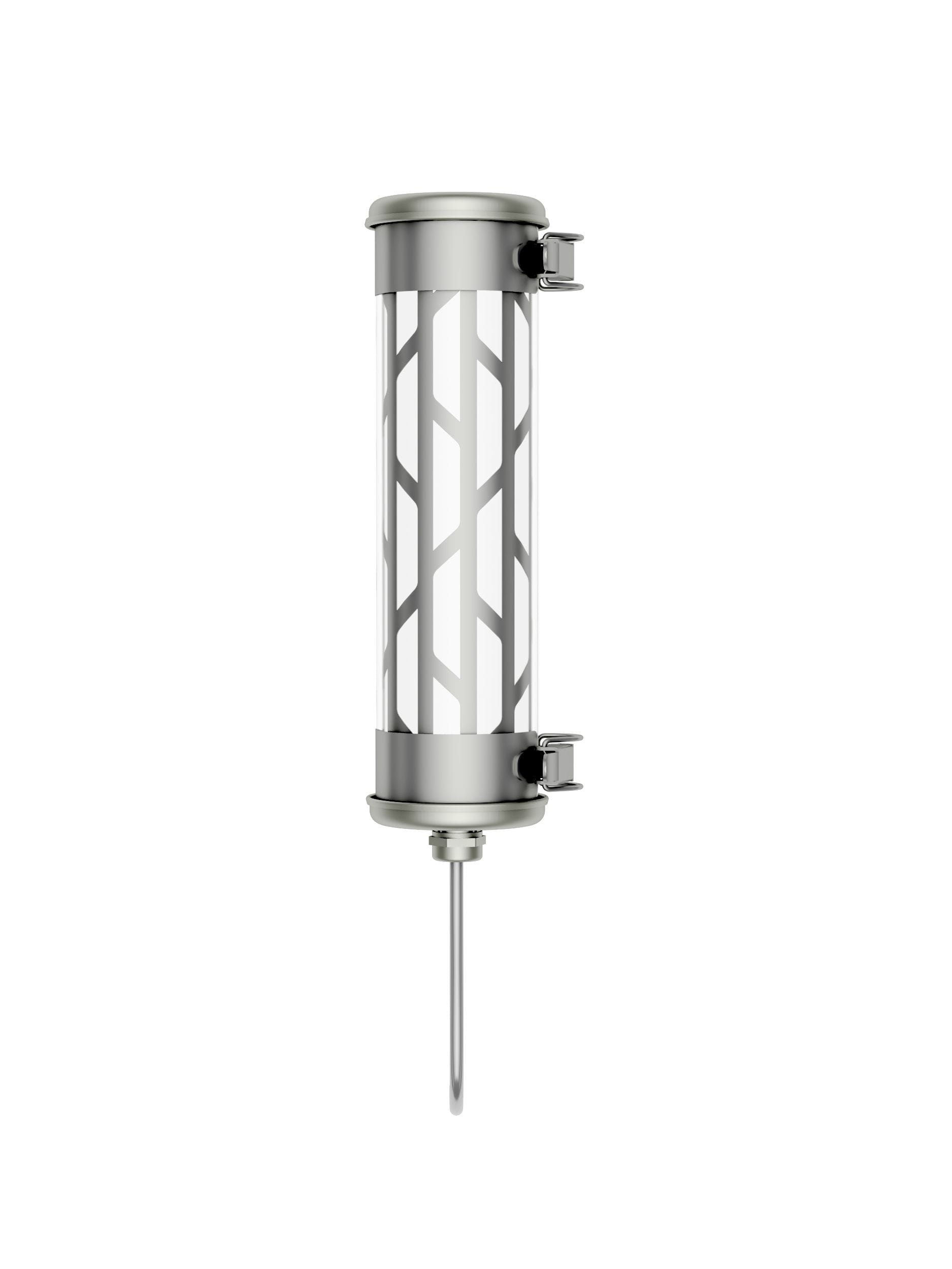 Applique murale compacte BELLEVILLE 70 360° (design : Normal Studio) - Pour éclairage d’ambiance avec grille à perforation base trapèze - Grille finition SILVER - Corps : Verre borosilicaté pour un usage intérieur/extérieur - Flasques & Colliers : Inox 316L - Grille en aluminium anodisé argenté insérée à l'intérieur de la vasque - Toute partie métallique externe en inox 316L et visserie en inox A4 - Douille E14 solidaire du flasque mobile - Joints : Joints moulés en EPDM - Avec 1 lampe filament LED E14 4W 2700K claire - Flux lumineux: 110 lm - Température de couleur: 2700 K - Gradation : Sans - Diamètre : 70 mm - Longueur hors tout: 270 mm - Fourni équipé de 0,50m de câble 3G1,5 avec tresse en cuivre étamé sous gaine transparente - Fixation par 2 colliers renforcés en inox à grenouillère (à entraxe variable) et permettant une orientation sur 360° - Fourni avec un boitier de sortie murale en inox 316L, usage intérieur (IP 40), à raccorder à la terre - Installation en position verticale, presse-étoupe vers le bas - Maintenance par démontage du flasque de fermeture porte douille - Garantie 5 ans - Température d'utilisation : -20°C à +30°C - Indice de protection : IP66/IP68/IP69K - Résistance aux chocs : IK07 - Classe électrique : Classe I - Alimentation : 220-240V 50/60Hz - Consommation: 4 W - Résistance au fil incandescent : Ininflammable - Poids: 1 kg - Conçu et fabriqué en France