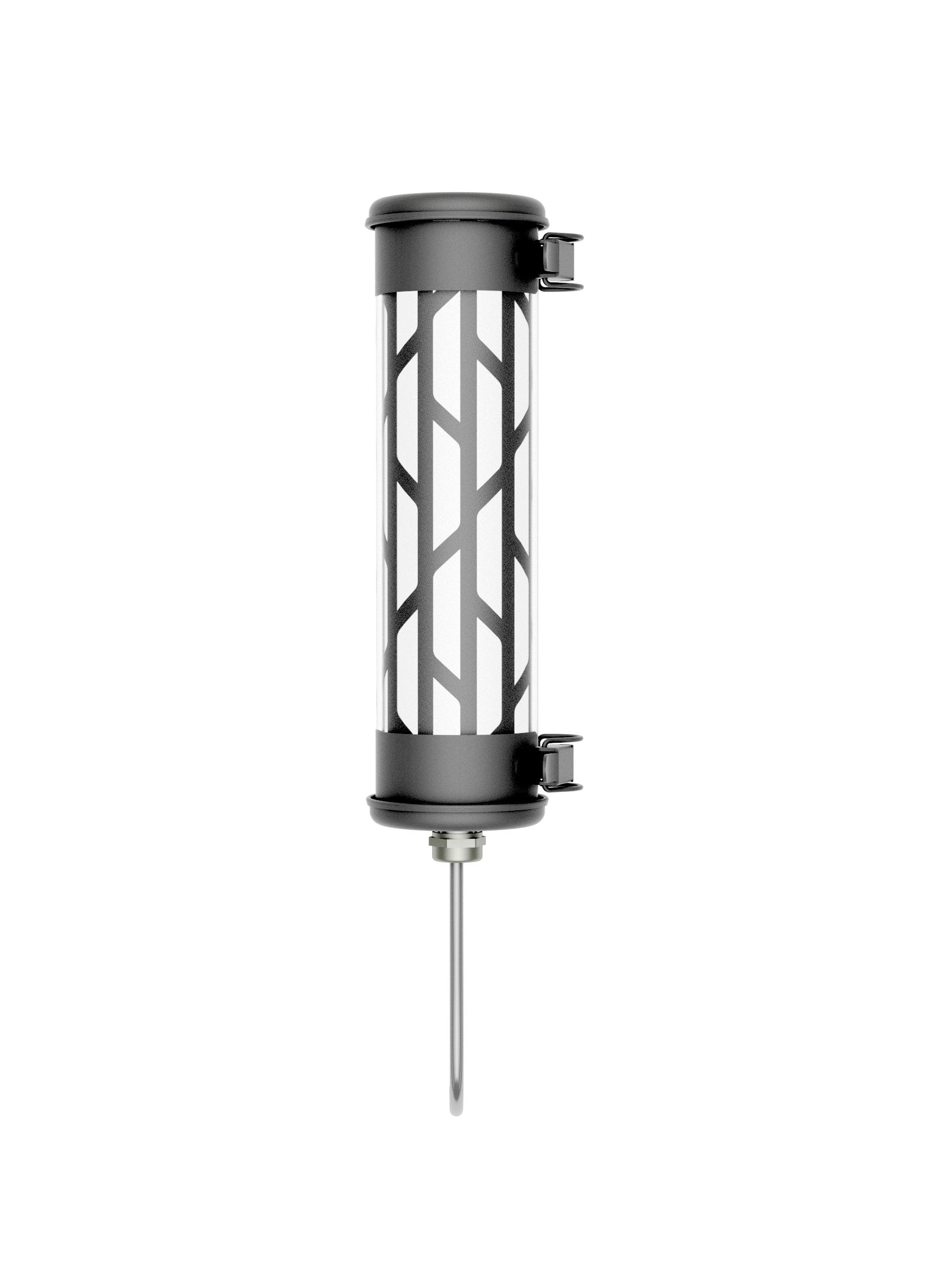 Applique murale compacte BELLEVILLE 70 360° (design : Normal Studio) - Pour éclairage d’ambiance avec grille à perforation base trapèze - Couleur : COAL (RAL 7021) - Grille finition COAL - Corps : Verre borosilicaté pour un usage intérieur/extérieur - Flasques & Colliers : Inox 316L laqués COAL (RAL 7021) - Grille en aluminium laqué COAL (RAL 7021) insérée entre la vasque et un film interne en polycarbonate blanc opalisé - Toute partie métallique externe en inox 316L et visserie en inox A4 - Douille E14 solidaire du flasque mobile - Joints : Joints moulés en EPDM - Avec 1 lampe filament LED E14 4W 2700K claire - Flux lumineux: 110 lm - Température de couleur: 2700 K - Gradation : Sans - Diamètre : 70 mm - Longueur hors tout: 270 mm - Fourni équipé de 0,50m de câble 3G1,5 avec tresse en cuivre étamé sous gaine transparente - Fixation par 2 colliers renforcés en inox à grenouillère (à entraxe variable) et permettant une orientation sur 360° - Fourni avec un boitier de sortie murale en inox 316L, usage intérieur (IP 40), à raccorder à la terre - Installation en position verticale, presse-étoupe vers le bas - Maintenance par démontage du flasque de fermeture porte douille - Garantie 5 ans - Température d'utilisation : -20°C à +30°C - Indice de protection : IP66/IP68/IP69K - Résistance aux chocs : IK07 - Classe électrique : Classe I - Alimentation : 220-240V 50/60Hz - Consommation: 4 W - Résistance au fil incandescent : Ininflammable - Poids: 1 kg - Conçu et fabriqué en France