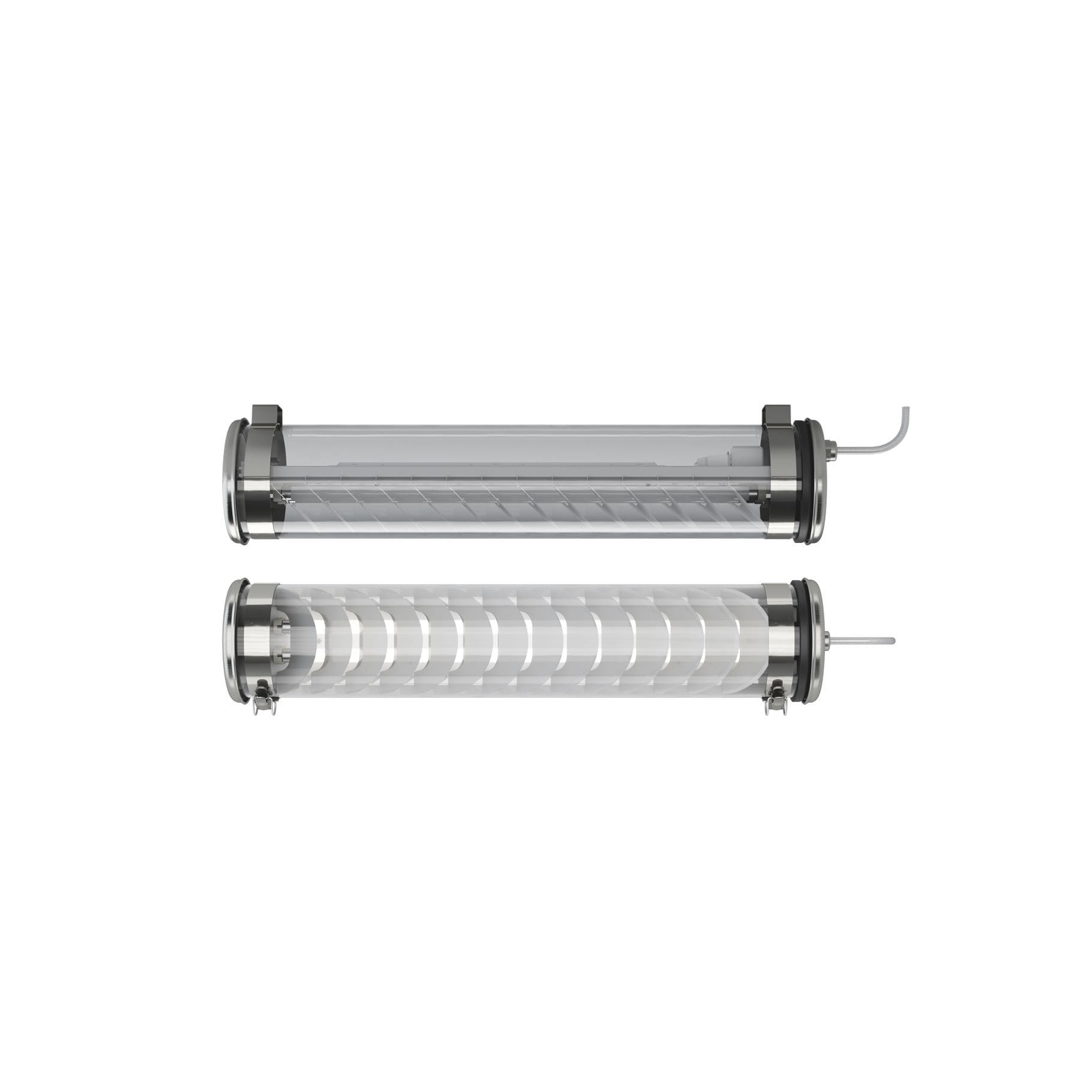 Applique murale verticale à flux dirigé Gounod - Vasque : Coextrudé de polycarbonate/PMMA insensible aux UV pour un usage intérieur/extérieur - Flasques & Colliers : Inox 304L - Grille de défilement longitudinale en aluminium brossé argenté à lamelles inclinées - Platine interne en tôle d’acier laquée grise RAL 9006 - Joints : Joints moulés en EPDM - Modules LED démontables à haute efficacité (IRC>80, 3 SDCM) - Flux lumineux: 3600 lm - Température de couleur: 2700 K - Optique primaire diffusante satinée spécifique - Driver à sortie en courant constant, gradable par bouton-poussoir - Diamètre : 133 mm - Longueur hors tout: 1295 mm - Entrée de câble par presse-étoupe en laiton nickelé pour câble Ø 5 à 14 mm - Raccordement sur bornier débrochable 5 x 2,5 mm² - Fixation par colliers renforcés en inox à grenouillère à entraxe variable et permettant une orientation sur 360° - Fermeture par serrage de l’écrou sous presse-étoupe - Ouverture et fermeture rapide par une seule vis - Maintenance par démontage du flasque mobile et coulissement de la platine guidée - Installation verticale : presse-étoupe vers le bas - Modules LED et driver facilement démontables - Garantie 5 ans - 50 000 h L80/B10 à 25°C - Température d’utilisation : -20 °C à +35 °C - Indice de protection : IP66/IP68/IP69K - Résistance aux chocs : IK10 - Classe I - Tension d'alimentation : 220-240V 0/50/60Hz - Consommation: 39 W - Efficacité lumineuse: 95 lm/W - Facteur de puissance > 0,95 - THD: 10 % - Risque photobiologique : Groupe 0 - Pic de courant d'appel: 17 A - Durée du courant d'appel à 50% du pic: 170 µs - Résistance au feu : 650 °C - Nombre de drivers sur MCB type B 16A: 28 pcs - Poids: 4 kg