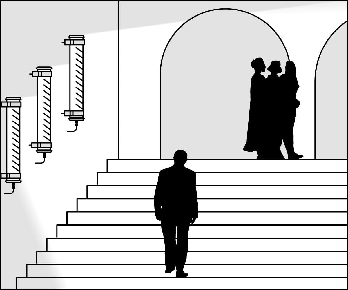 Applique murale verticale à flux dirigé Gounod - Vasque : Coextrudé de polycarbonate/PMMA insensible aux UV pour un usage intérieur/extérieur - Flasques & Colliers : Inox 304L - Grille de défilement longitudinale en aluminium brossé argenté à lamelles inclinées - Platine interne en tôle d’acier laquée grise RAL 9006 - Joints : Joints moulés en EPDM - Modules LED démontables à haute efficacité (IRC>80, 3 SDCM) - Flux lumineux: 3600 lm - Température de couleur: 3000 K - Optique primaire diffusante satinée spécifique - Driver à sortie en courant constant, non gradable - Diamètre : 133 mm - Longueur hors tout: 1295 mm - Entrée de câble par presse-étoupe en laiton nickelé pour câble Ø 5 à 14 mm - Raccordement sur bornier débrochable 3 x 2,5 mm² - Fixation par colliers renforcés en inox à vis CHC à entraxe variable et permettant une orientation sur 360° - Fermeture par serrage de l’écrou sous presse-étoupe - Ouverture et fermeture rapide par une seule vis - Maintenance par démontage du flasque mobile et coulissement de la platine guidée - Installation verticale : presse-étoupe vers le bas - Modules LED et driver facilement démontables - Garantie 5 ans - 50 000 h L80/B10 à 25°C - Température d’utilisation : -20 °C à +35 °C - Indice de protection : IP66/IP68/IP69K - Résistance aux chocs : IK10 - Classe II - Tension d'alimentation : 220-240V 0/50/60Hz - Consommation: 39 W - Efficacité lumineuse: 92 lm/W - Facteur de puissance > 0,95 - THD: 12 % - Risque photobiologique : Groupe 0 - Pic de courant d'appel: 32 A - Durée du courant d'appel à 50% du pic: 240 µs - Résistance au feu : 650 °C - Nombre de drivers sur MCB type B 16A: 16 pcs - Poids: 4 kg