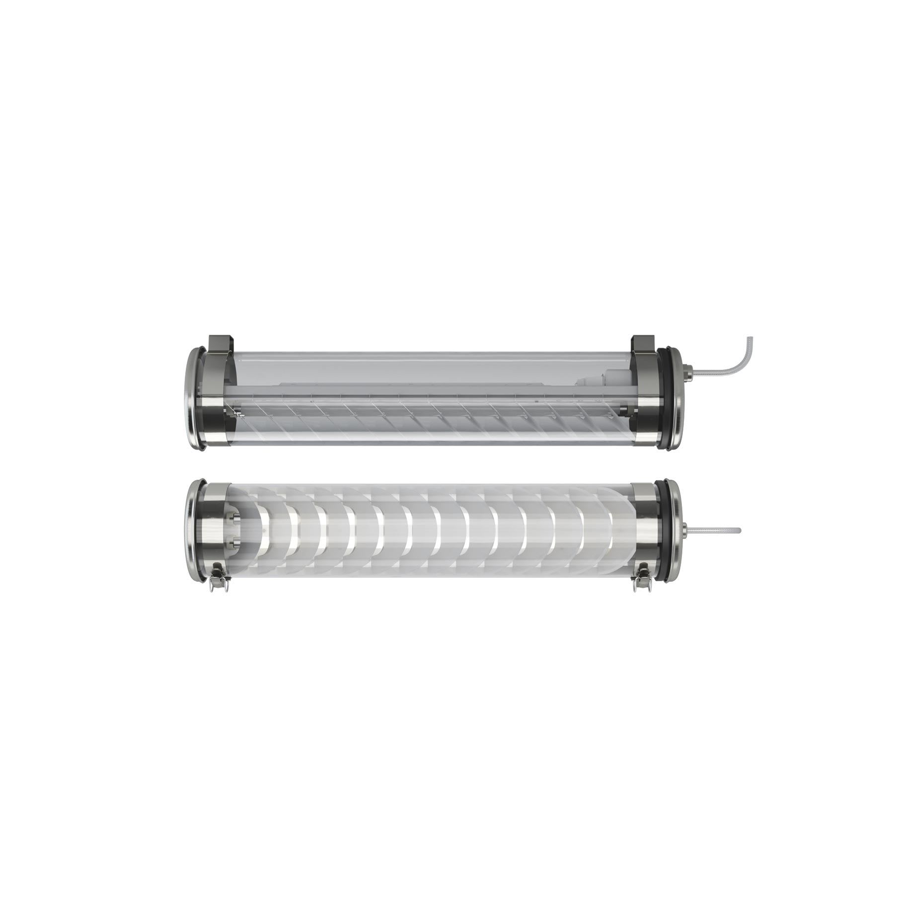 Applique murale verticale à flux dirigé Gounod - Vasque : Coextrudé de polycarbonate/PMMA insensible aux UV pour un usage intérieur/extérieur - Flasques & Colliers : Inox 304L - Grille de défilement longitudinale en aluminium brossé argenté à lamelles inclinées - Platine interne en tôle d’acier laquée grise RAL 9006 - Joints : Joints moulés en EPDM - Modules LED démontables à haute efficacité (IRC>80, 3 SDCM) - Flux lumineux: 4500 lm - Température de couleur: 3000 K - Optique primaire diffusante satinée spécifique - Driver à sortie en courant constant, gradable par bouton-poussoir - Diamètre : 133 mm - Longueur hors tout: 1595 mm - Entrée de câble par presse-étoupe en laiton nickelé pour câble Ø 5 à 14 mm - Raccordement sur bornier débrochable 5 x 2,5 mm² - Fixation par colliers renforcés en inox à grenouillère à entraxe variable et permettant une orientation sur 360° - Fermeture par serrage de l’écrou sous presse-étoupe - Ouverture et fermeture rapide par une seule vis - Maintenance par démontage du flasque mobile et coulissement de la platine guidée - Installation verticale : presse-étoupe vers le bas - Modules LED et driver facilement démontables - Garantie 5 ans - 50 000 h L80/B10 à 25°C - Température d’utilisation : -20 °C à +35 °C - Indice de protection : IP66/IP68/IP69K - Résistance aux chocs : IK10 - Classe I - Tension d'alimentation : 220-240V 0/50/60Hz - Consommation: 47 W - Efficacité lumineuse: 96 lm/W - Facteur de puissance > 0,95 - THD: 9 % - Risque photobiologique : Groupe 0 - Pic de courant d'appel: 25 A - Durée du courant d'appel à 50% du pic: 280 µs - Résistance au feu : 650 °C - Nombre de drivers sur MCB type B 16A: 24 pcs - Poids: 4,7 kg