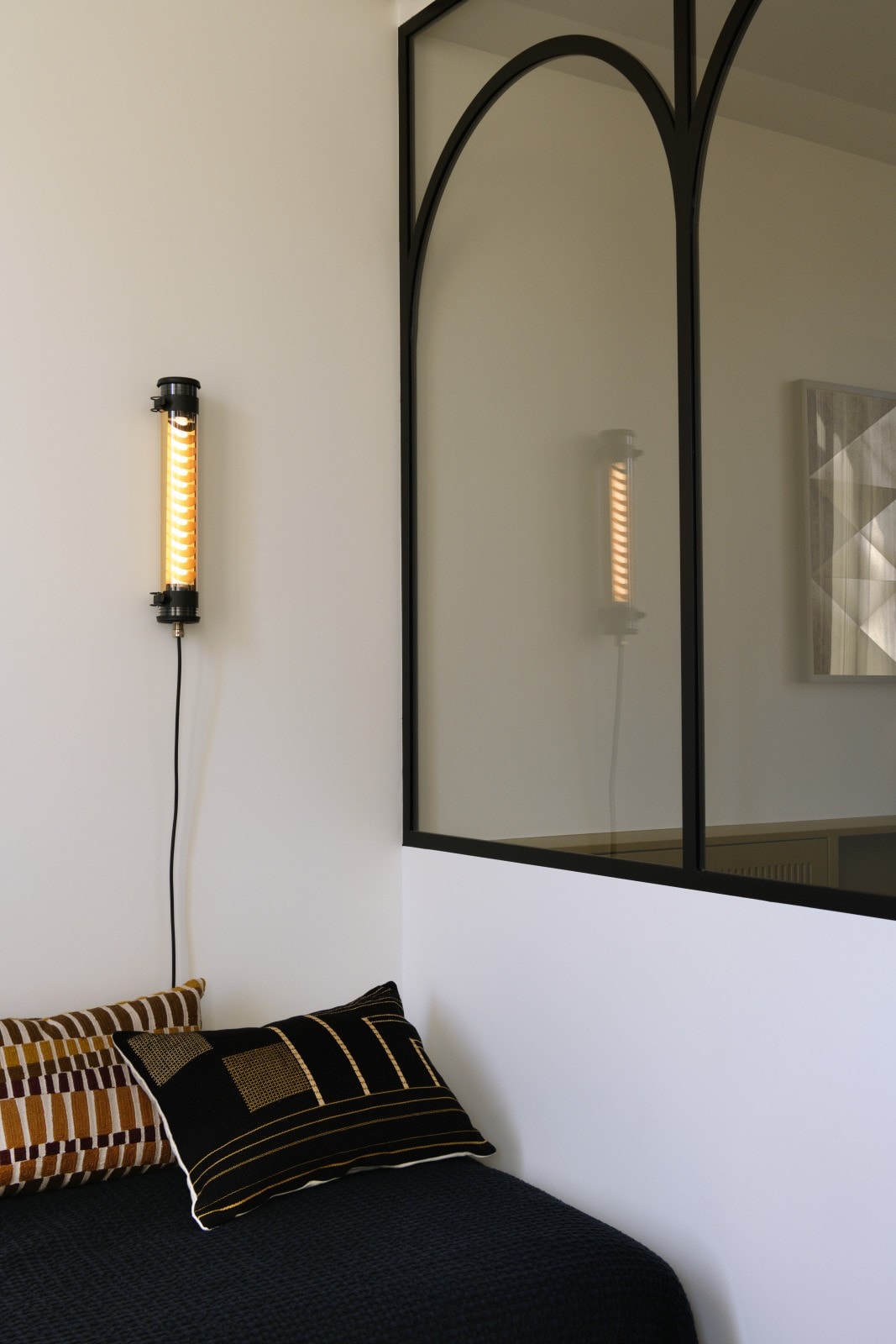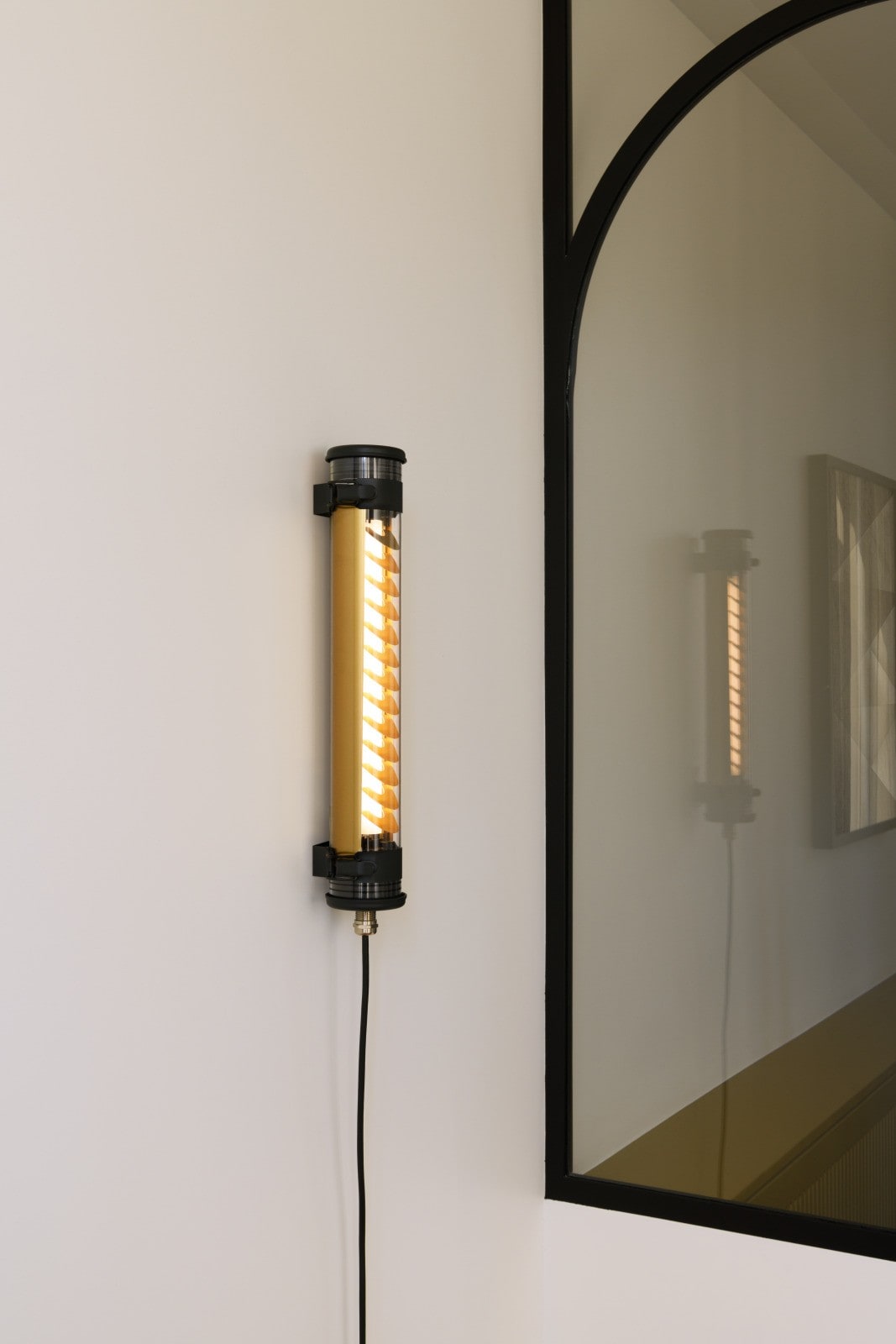 Applique murale à flux dirigé Elgar Push - Couleur : COAL (RAL 7021) - Cache-appareillage interne roulé en aluminium anodisé : BRASS - Vasque : Coextrudé de polycarbonate/PMMA insensible aux UV pour un usage intérieur/extérieur - Flasques & Colliers : Inox 316L laqués COAL (RAL 7021) - Grille de défilement longitudinale en aluminium couleur laiton à lamelles inclinées - Toute partie métallique externe en inox 316L et visserie en inox A4 - Platine interne en tôle d’acier laquée grise RAL 9006 - Joints : Joints moulés en EPDM - Bouton poussoir integré sur flasque - Modules LED démontables à haute efficacité (IRC>80, 3 SDCM) - Flux lumineux: 275 lm - Température de couleur: 2700 K - Optique primaire diffusante satinée spécifique - Grille de défilement réversible - Driver à sortie en courant constant, gradable par bouton-poussoir intégré - Diamètre : 70 mm - Longueur hors tout: 430 mm - Entrée de câble par presse-étoupe en laiton nickelé pour câble Ø 8 à 12 mm - Fourni équipé de 2m de câble 2x0,75 mm² noir avec prise européenne pour utilisation intérieure - Raccordement sur bornier automatique 2x2,5mm² - Fixation par colliers renforcés en inox à grenouillère à entraxe variable et permettant une orientation sur 360° - Ouverture et fermeture par serrage de l’écrou sous presse-étoupe - Installation verticale : presse-étoupe vers le bas - Maintenance par démontage du flasque mobile et coulissement de la platine guidée - Modules LED et driver facilement démontables - Garantie 5 ans - 50 000 h L80/B10 à 25°C - Température d’utilisation : -20 °C à +35 °C - Étanchéité : IP65, pour usage intérieur - Résistance aux chocs : IK10 - Classe électrique : Classe II - Tension d'alimentation : 220-240 V 50/60 Hz - Consommation: 5 W - Efficacité lumineuse: 55 lm/W - Facteur de puissance > 0,85 - THD: 19 % - Risque photobiologique : Groupe 0 - Pic de courant d'appel: 5 A - Résistance au feu : 650 °C - Nombre de drivers sur MCB type B 16A: 130 pcs - Poids: 2,9 kg - Conçu et fabriqué en France