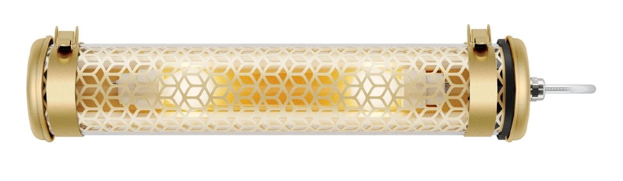 Applique tubulaire Vendôme 100 2L (design : Normal Studio) - Grille à perforation nid d'abeille - Grille finition BRASS - Vasque : Coextrudé de polycarbonate/PMMA insensible aux UV pour un usage intérieur/extérieur - Flasques & Colliers : Inox 316L - Réflecteur en aluminium anodisé : BRASS - Grille en aluminium anodisé laiton insérée à l'intérieur de la vasque - Toute partie métallique externe en inox 316L et visserie en inox A4 - Platine inox avec 2 douilles porcelaine E14 - Joints : Joints moulés en EPDM - Avec 2 lampes filament LED E14 4W 2700K claires - Flux lumineux: 250 lm - Température de couleur: 2700 K - Gradation par un module CASAMBI intégré - Diamètre : 100 mm - Longueur hors tout: 519 mm - Fourni équipé de 1m de câble 3G1,5 avec tresse en cuivre étamé sous gaine transparente - Fixation par 2 colliers renforcés en inox à grenouillère (à entraxe variable) et permettant une orientation sur 360° - Fourni avec un boitier de sortie murale en inox 316L, usage intérieur (IP 40), à raccorder à la terre - Installation en position verticale, presse-étoupe vers le bas - Garantie 5 ans - Température d’utilisation : -20 °C à +35 °C - Indice de protection : IP66/IP68/IP69K - Résistance aux chocs : IK10 - Classe électrique : Classe I - Alimentation : 220-240V 50/60Hz - Consommation: 8 W - Résistance au fil incandescent : 650°C - Poids: 1,8 kg - Conçu et fabriqué en France