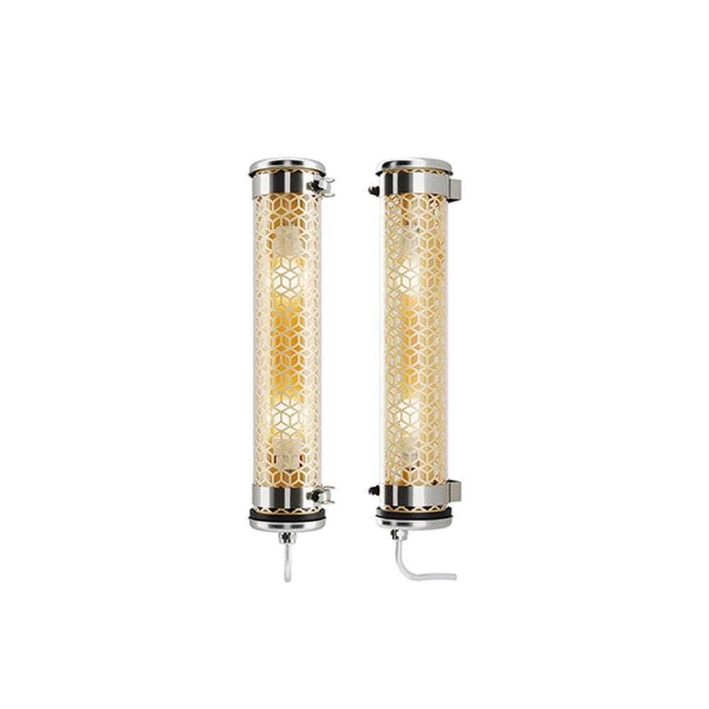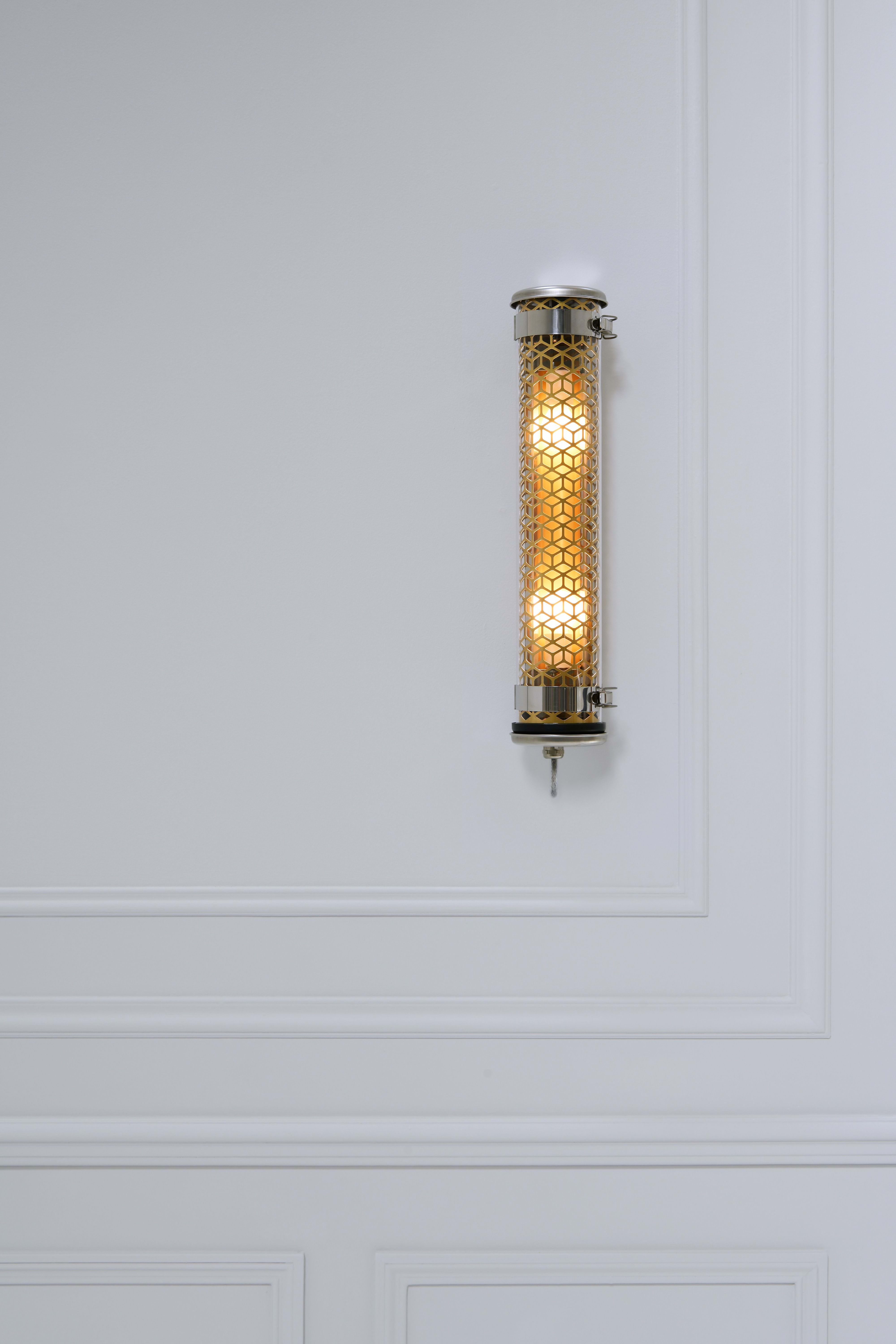 Applique tubulaire Vendôme 100 2L (design : Normal Studio) - Grille à perforation nid d'abeille - Grille finition BRASS - Vasque : Coextrudé de polycarbonate/PMMA insensible aux UV pour un usage intérieur/extérieur - Flasques & Colliers : Inox 316L - Réflecteur en aluminium anodisé : BRASS - Grille en aluminium anodisé laiton insérée à l'intérieur de la vasque - Toute partie métallique externe en inox 316L et visserie en inox A4 - Platine inox avec 2 douilles porcelaine E14 - Joints : Joints moulés en EPDM - Avec 2 lampes filament LED E14 4W 2700K claires - Flux lumineux: 250 lm - Température de couleur: 2700 K - Gradation : Sans - Diamètre : 100 mm - Longueur hors tout: 519 mm - Fourni équipé de 1m de câble 3G1,5 avec tresse en cuivre étamé sous gaine transparente - Fixation par 2 colliers renforcés en inox à grenouillère (à entraxe variable) et permettant une orientation sur 360° - Fourni avec un boitier de sortie murale en inox 316L, usage intérieur (IP 40), à raccorder à la terre - Installation en position verticale, presse-étoupe vers le bas - Garantie 5 ans - Température d’utilisation : -20 °C à +35 °C - Indice de protection : IP66/IP68/IP69K - Résistance aux chocs : IK10 - Classe électrique : Classe I - Alimentation : 220-240V 50/60Hz - Consommation: 8 W - Résistance au fil incandescent : 650°C - Poids: 1,8 kg - Conçu et fabriqué en France